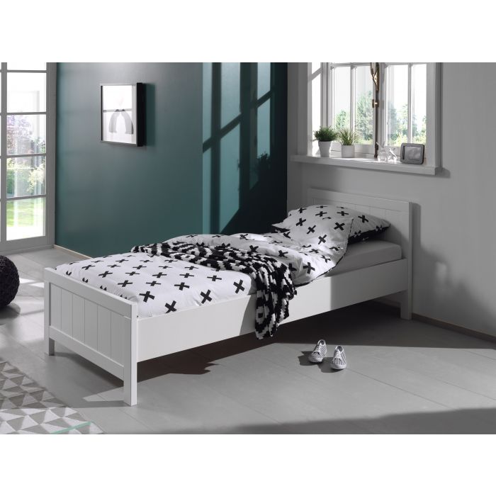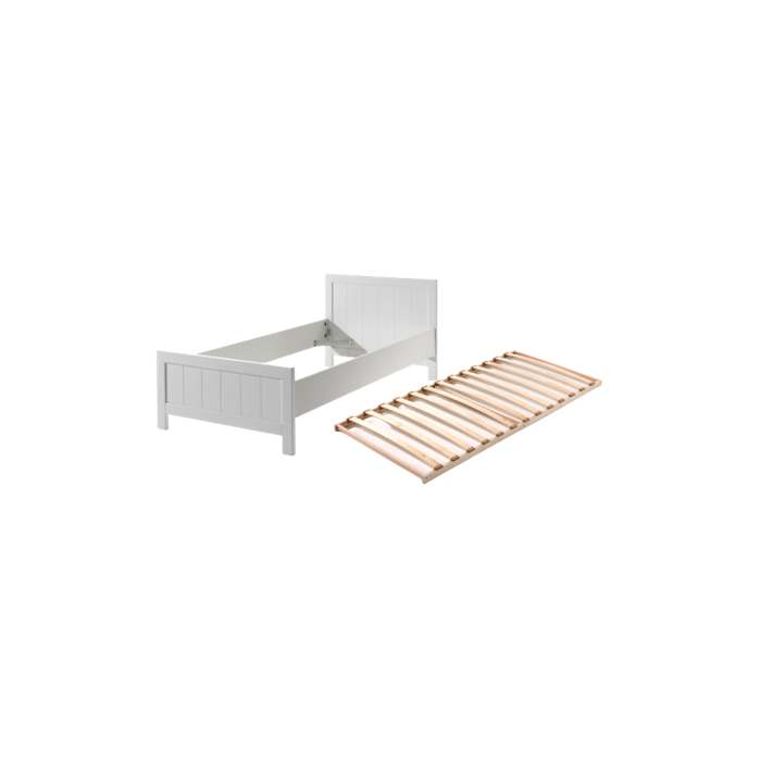 This single bed (90x200) from the ERIK collection is made out of white lacquered MDF in combination with solid pine. The head and foot of the bed have vertical grooves. The slatbase with 13 slats is included. The simple yet cottage design makes it perfect for every kids or young adult bedroom.