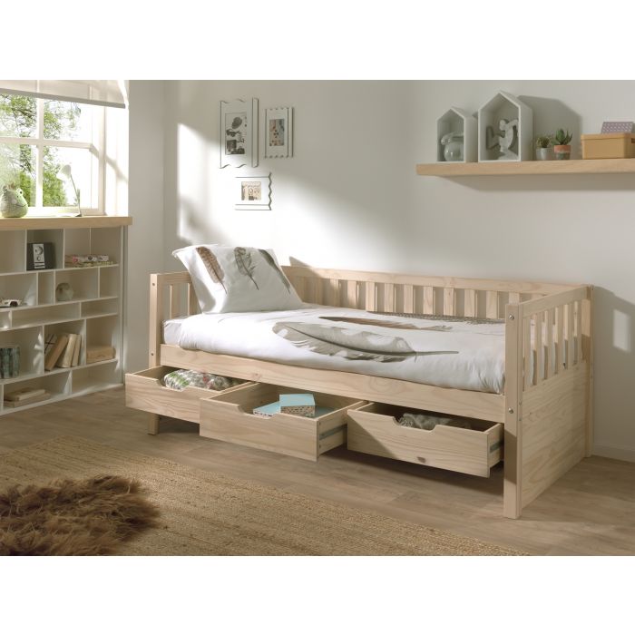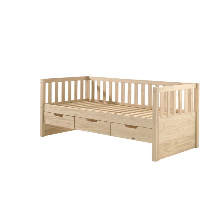 This captain bed (90x200) from the FRITZ collection is made out of solid pine and has slatted design at back and sides. The bed has 3 drawers for extra storage space. The minimalistic yet trendy design makes it perfect for every interior.