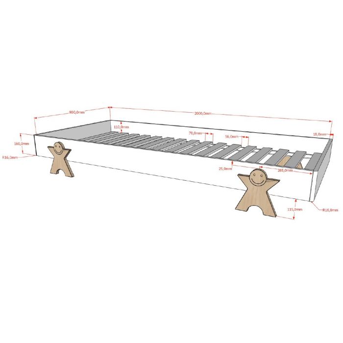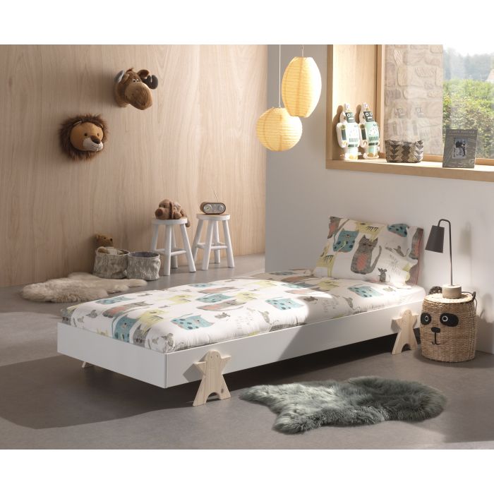 This extremely practical stackable bed from the MODULO collection is made of a combination of MDF and solid pine. The slatted base is included. If you have several beds, you can easily stack them to make room. The mattress can perfectly remain in the stacked beds. The solid smiley legs make the bed super trendy!