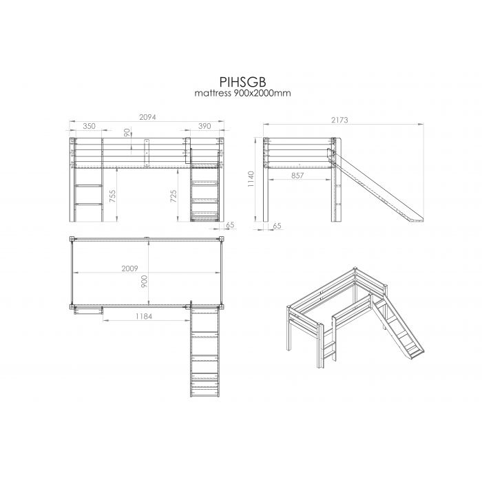 This PINO mid-sleeper is made of solid pine and is grey lacquered. Children love the slide and ladder that can be mounted on either the left or right side. The slatted base is included. The all-round fall protection, wide steps and good stability make this bed very safe. The space under the bed can be used for playing or as storage space. There are various options available in the PINO range to supplement this bed with a desk, library, chests, hanging shelf or nice textile set.
