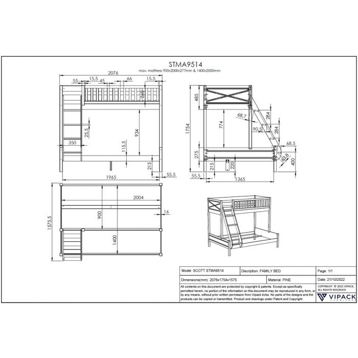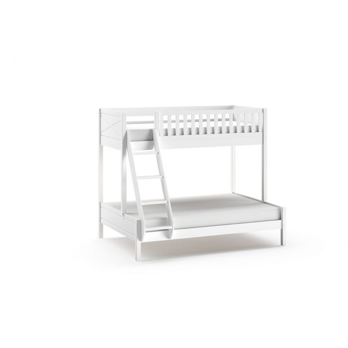 The SCOTT family bed is white lacquered and made of solid Scandinavian pine. The slatted bases are included. This bed guarantees maximum sleeping capacity with minimum space. The family bed contains 3 sleeping places. At the top there is provision for 1 person (90x200cm) and at the bottom 2 people (140x200cm) can sleep. An optional drawer can be added. You can choose 1 large bed drawer that can be used as an extra sleeping place for guests, or 2 smaller drawers for storing toys, books, bed linen,...