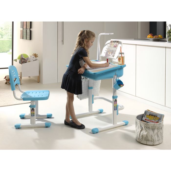 Ergonomischer und funktioneller Kinderschreibtisch mit Höhenverstellung und passendem Schreibtischstuhl, aus der Comfort Serie in der Farbe Weiß/Blau. Hiermit bekommen Sie für Ihr Kind ein komplettes Set für das Kinderzimmer. Der Kinderschreibtisch und ebenso der Stuhl haben ein stabiles, weiß lackiertes Metallrohrgestell. Die ausladenden Füße bieten eine hohe Standfestigkeit von Tisch und Stuhl. Zudem befinden sich in den Kunststoffkappen der Füße jeweils Höhenversteller für die Feinjustierung. Die Schreibplatte (Maße der Arbeitsfläche ca.: B: 70,5x T: 54,5 cm) ist aus hochwertigem und strapazierfäigem MDF, ummantelt mit einer ABS-Dickkante. Die Kanten der Platte sind alle gerundet und vorne an der Einbuchtung befindet sich eine Abrutschperre. Oberhalb befindet sich ein feststehendes Element mit Stifteschalen und Montagevorrichtung für den Bücherhalter und der LED Schreibtischlampe (beides aus Kunststoff). Die Beleuchtung ist CE zertifiziert, hat 12 W und eine Farbtemparatur von 6000 K. Unter der aufklappbaren Schreibplatte befindet sich ein breites und geräumiges Fach (stabiler Kunststoff) für Schreibmaterial und Utensilien. Damit ist immer alles griffbereit. Die in der Neigung verstellbare Schreibplatte (von 0 - 6,5° Neigung) ermöglicht eine ergonomisch optimale Haltung beim Lesen, Malen oder Schreiben. Dies wird auch durch die Höhenverstellung des Tischgestells unterstützt. Sie können das Gestell in der Arbeitshöhe von 54 cm bis zu 76 cm verstellen. Gleichfalls gehören zum Lieferumfang ein Taschenhalter und Stiftebecher dazu, der auf den Taschenhalter gesteckt werden kann. Der Schreibtischstuhl hat einen strapazierfähigen, geformten Sitz und Rücken aus Kunststoff. Für die bessere Luftzirkulastion haben beide Lüftungsschlitze. Auch der Stuhl ist höhenverstellbar und kann von 30 cm bis zu 44 cm Sitzhöhe angepasst werden. So lässt sich der Schreibtisch und der Stuhl ergonomisch optimal aufeinander abstimmen. Der Artikel ist zerlegt mit Aufbauanleitung zur einfachen Selbstmontage. Die Stellfläche beträgt für den Tisch ca. B: 71 x H: 54-76 x T: 54,5 cm, Stellfläche für den Stuhl ca.: B: 36,5 x H: 65,3-79,3 x T: 41,8 cm. Empfohlenes Alter: Kinder von 3 - 10 Jahre. Der Artikel ist nach EN71-3 gebaut.