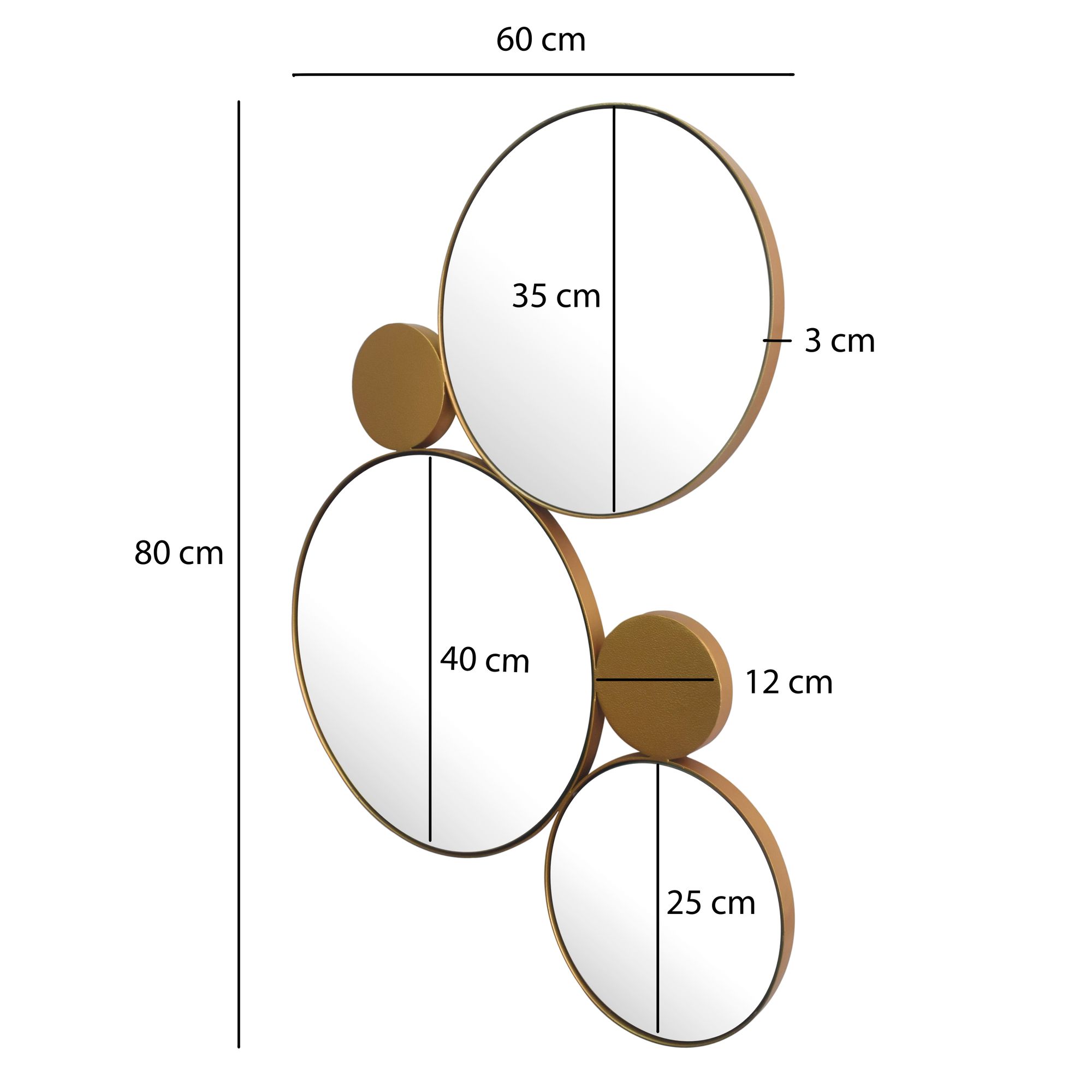 Informations sur le produit "Miroir mural métallique doré | 80x60 cm | Trois miroirs ronds avec cercles décoratifs"