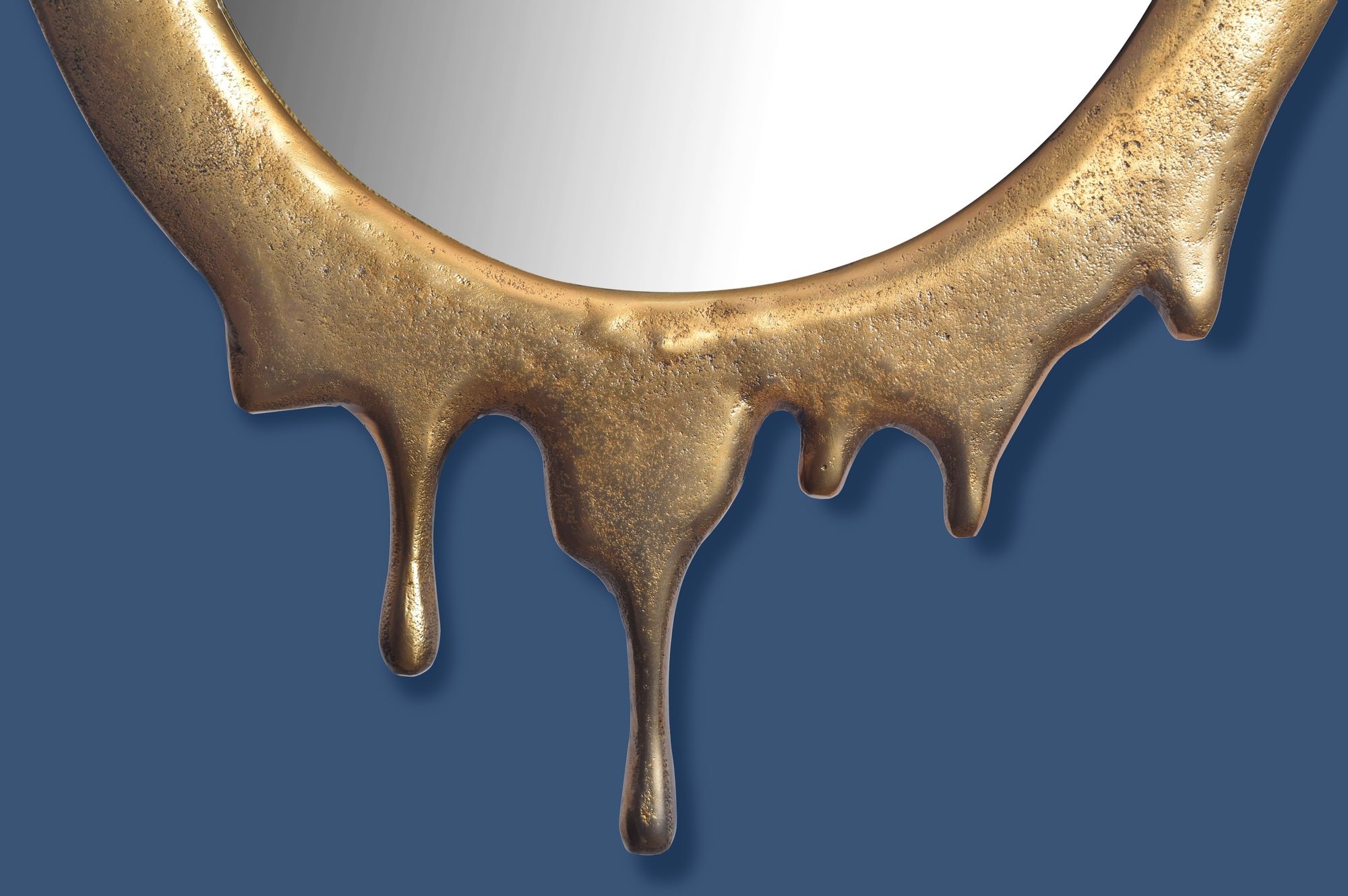Apportez une touche d'originalité à votre intérieur avec ce miroir mural ovale au cadre doré en aluminium, dont la partie inférieure évoque un métal qui semble fondre. Chaque pièce est fabriquée à la main, garantissant un aspect unique et contemporain.