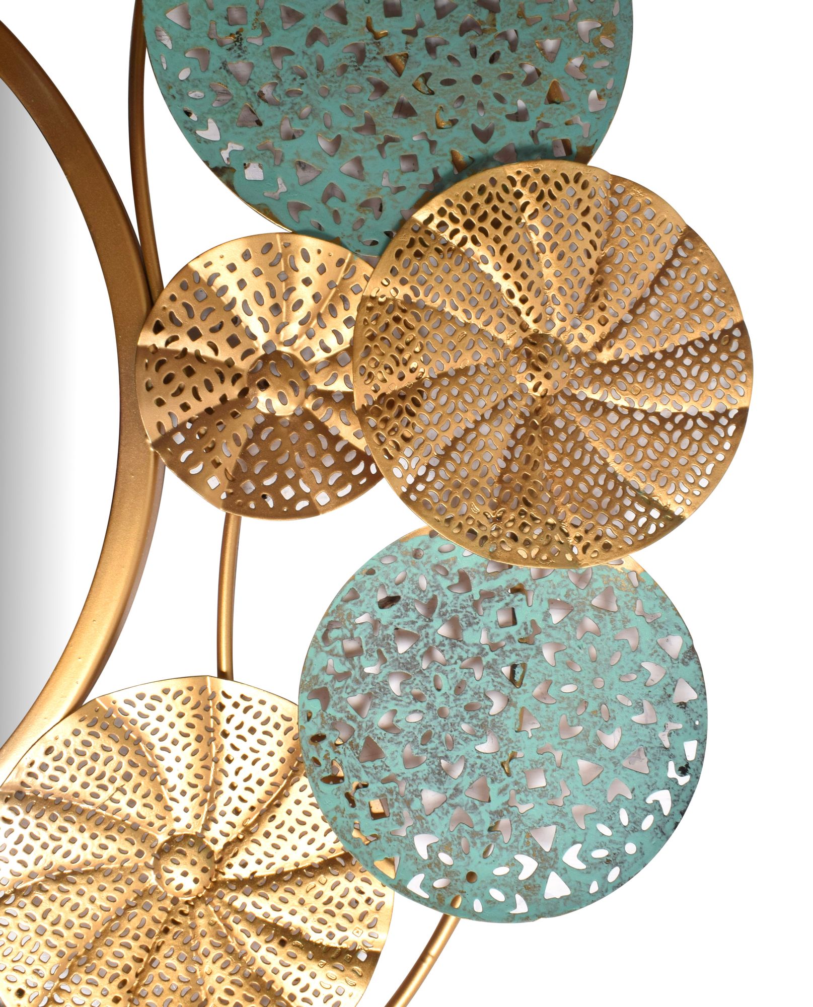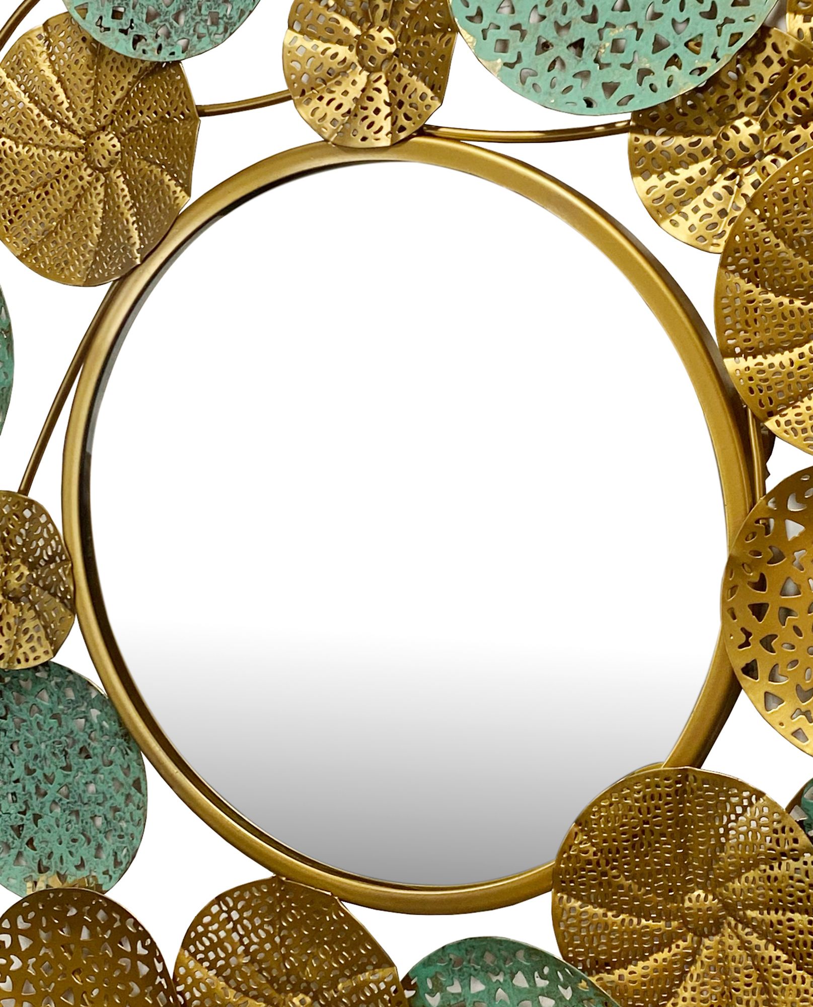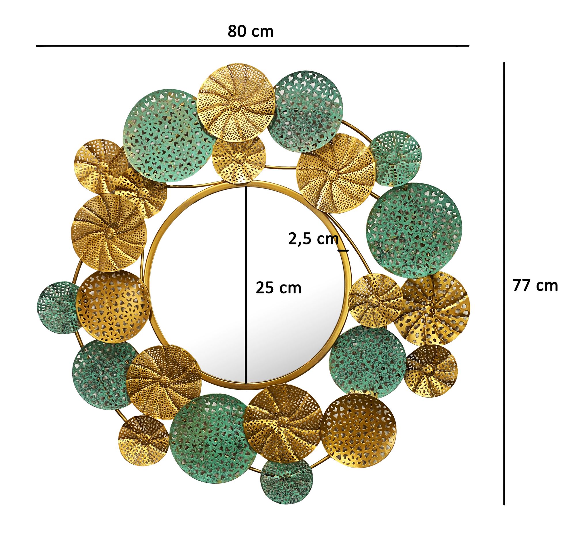 Informations sur le produit "Miroir mural rond verre et fer doré patiné | 80x77 cm | Cadre or et patine verte"