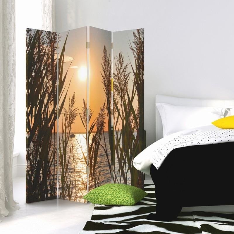 Paravent à deux faces 145 cm fabriqué en mdf et toile avec image coucher de soleil sur le lac