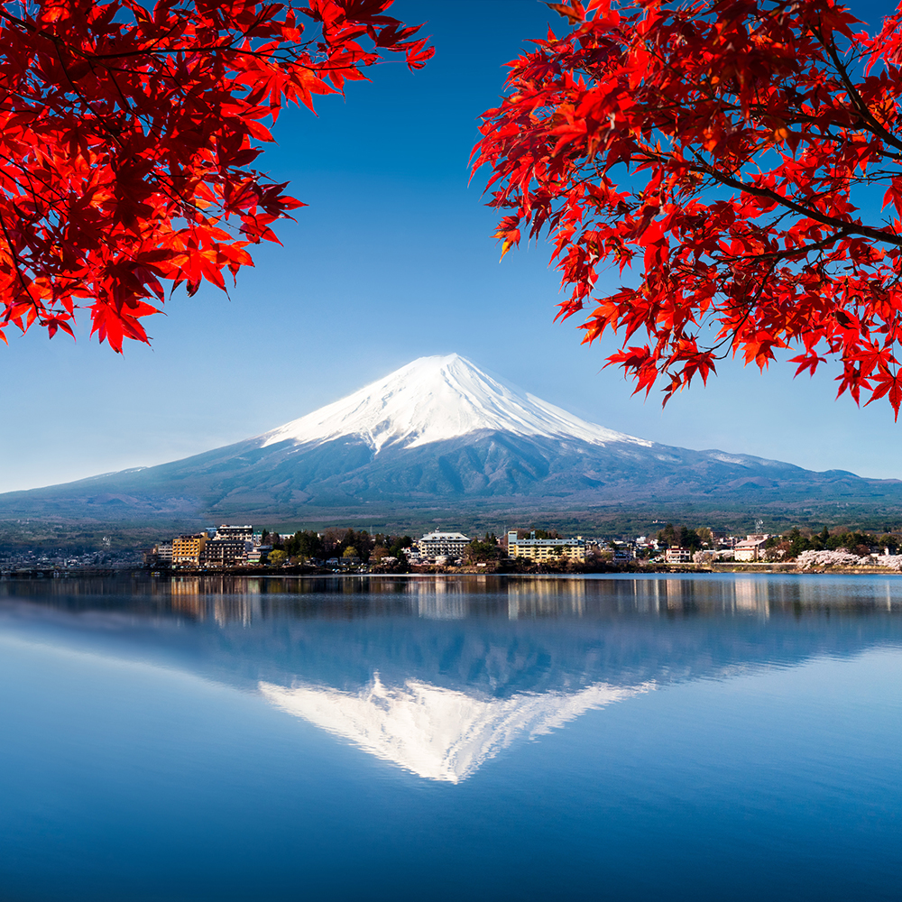 Paravent à deux faces 145 cm fabriqué en mdf et toile avec image du mont fuji et de feuilles rouges