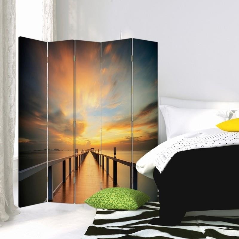 Paravent à deux faces 180 cm fabriqué en mdf et toile avec image de pont au coucher du soleil