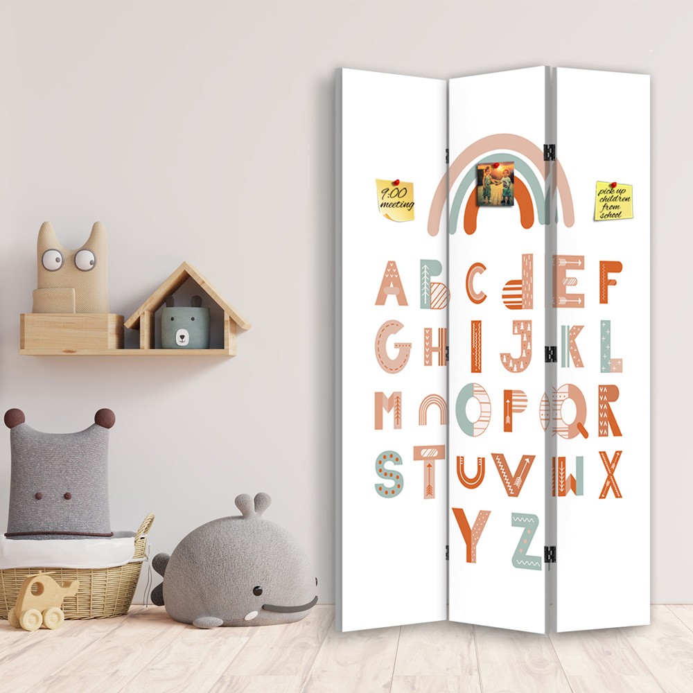 Paravent avec image d'un alphabet et d'un arc-en-ciel fabriqué en mdf et toile