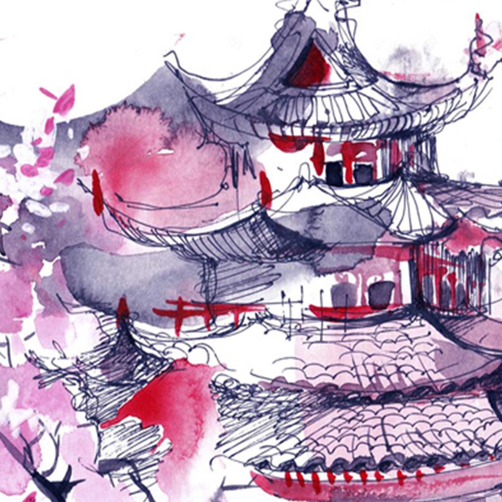 Informations sur le produit "Paravent avec image d'une pagode couleur violette fabriqué en mdf et toile"