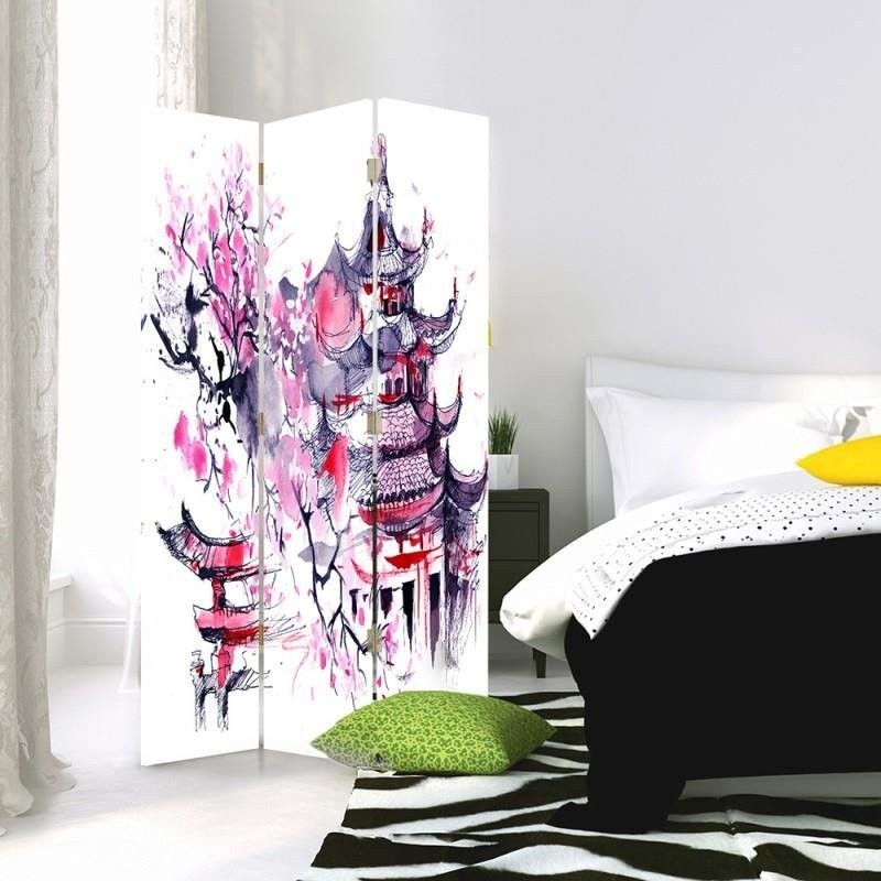Paravent avec image d'une pagode couleur violette fabriqué en mdf et toile