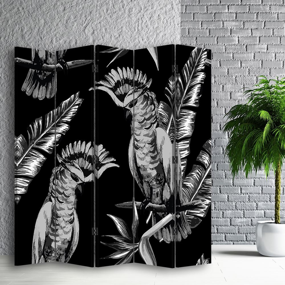 Description et caractéristiques - Paravent séparateur d'espaces avec dessin de cacatoès imprimé sur toile blanc et noir avec cadre en MDF