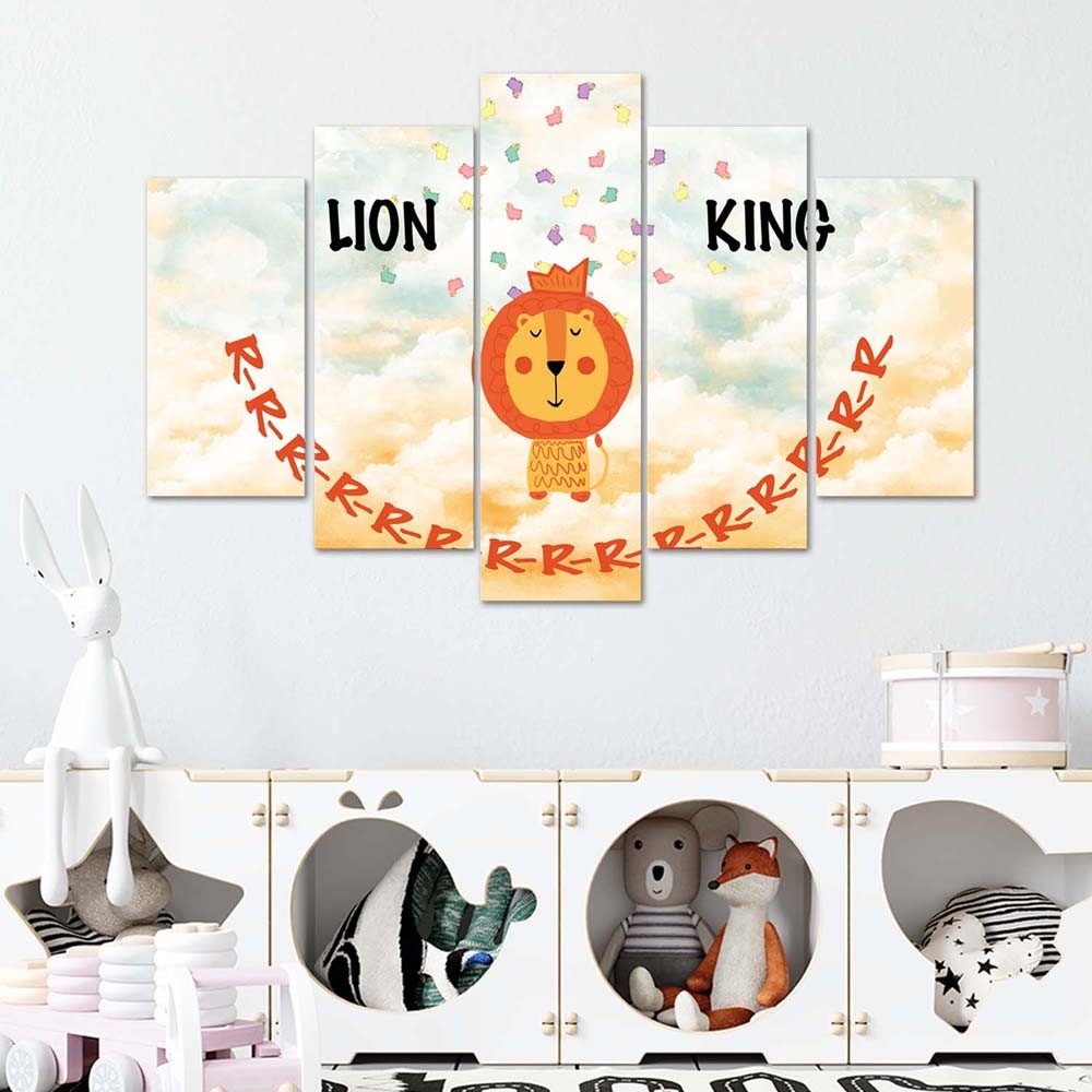 Cadre de cinq panneaux imprimés sur papier finition orange encadrement en hdf roi lion