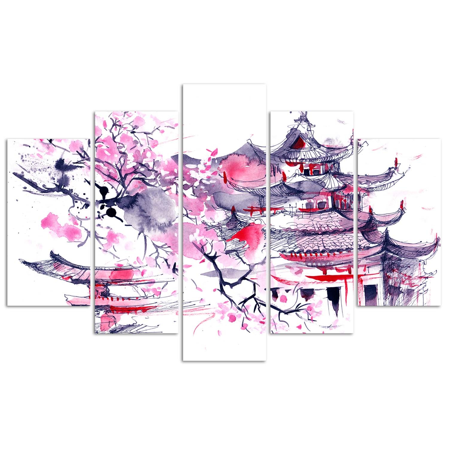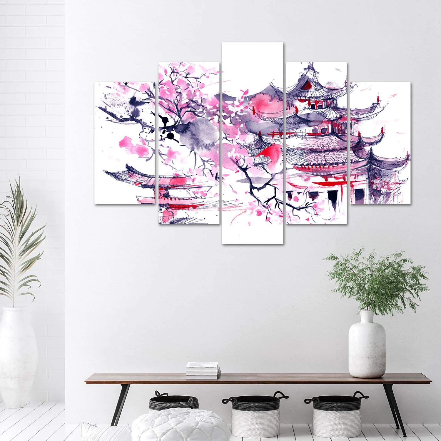 - Cadre composé de cinq pièces « paysage japonais » imprimé sur toile en HDF (fibre de haute densité).