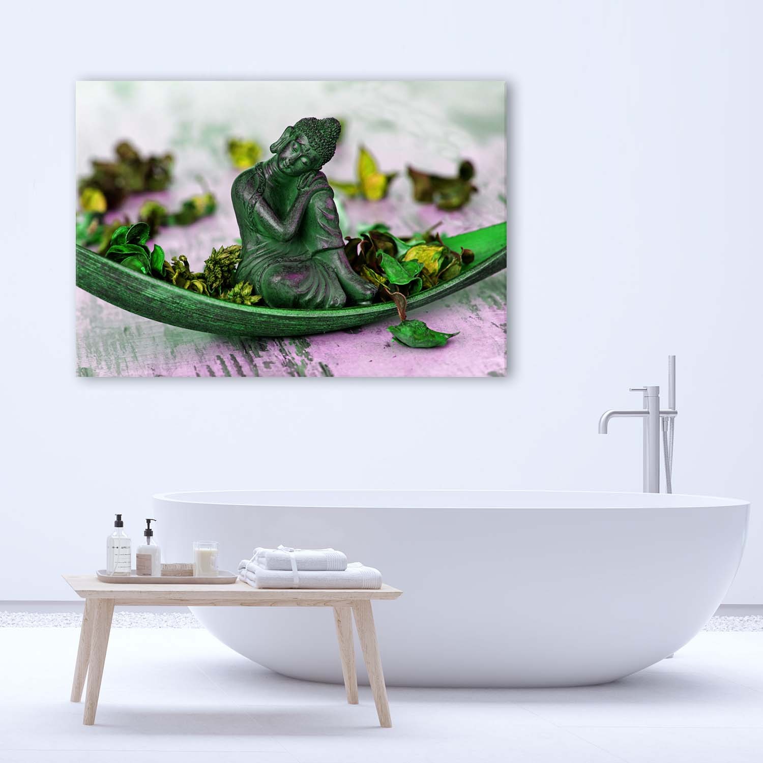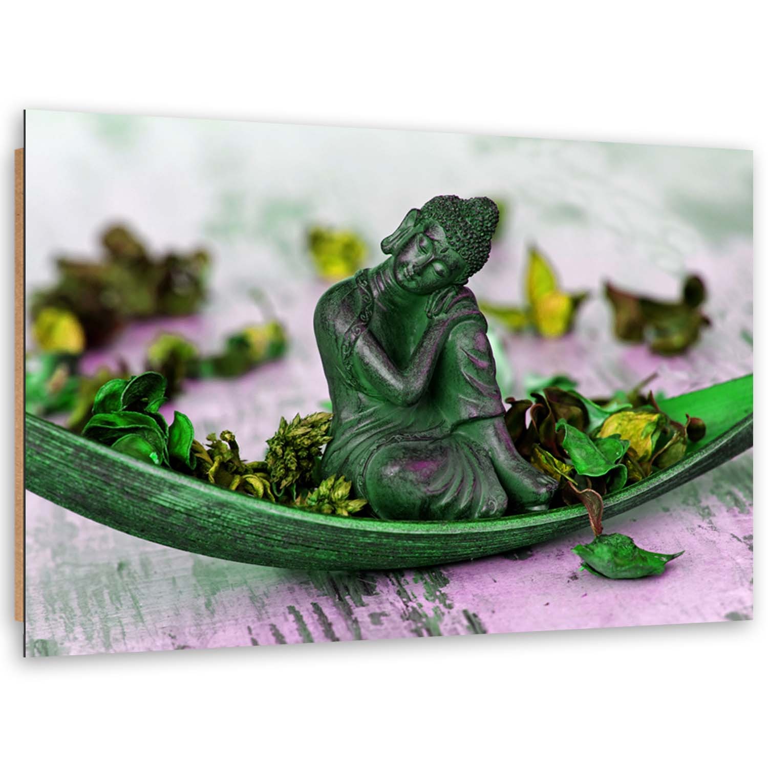 Informations sur le produit "Cadre décoratif avec image de bouddha sur des feuilles et pétales de multiples couleurs"