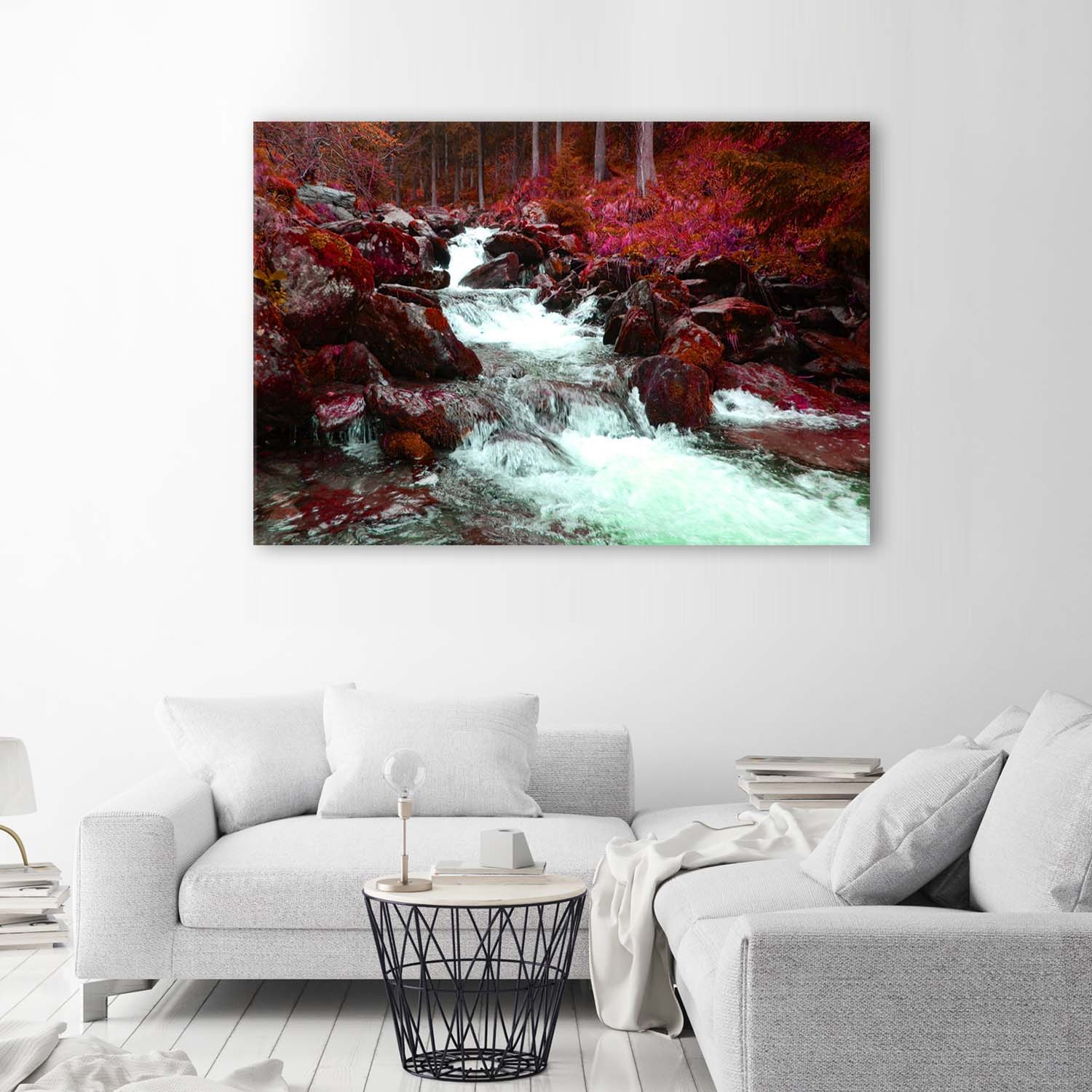 Informations sur le produit "Cadre décoratif avec image de rivière de montagne imprimée sur papier avec encadrement en mdf rouge"