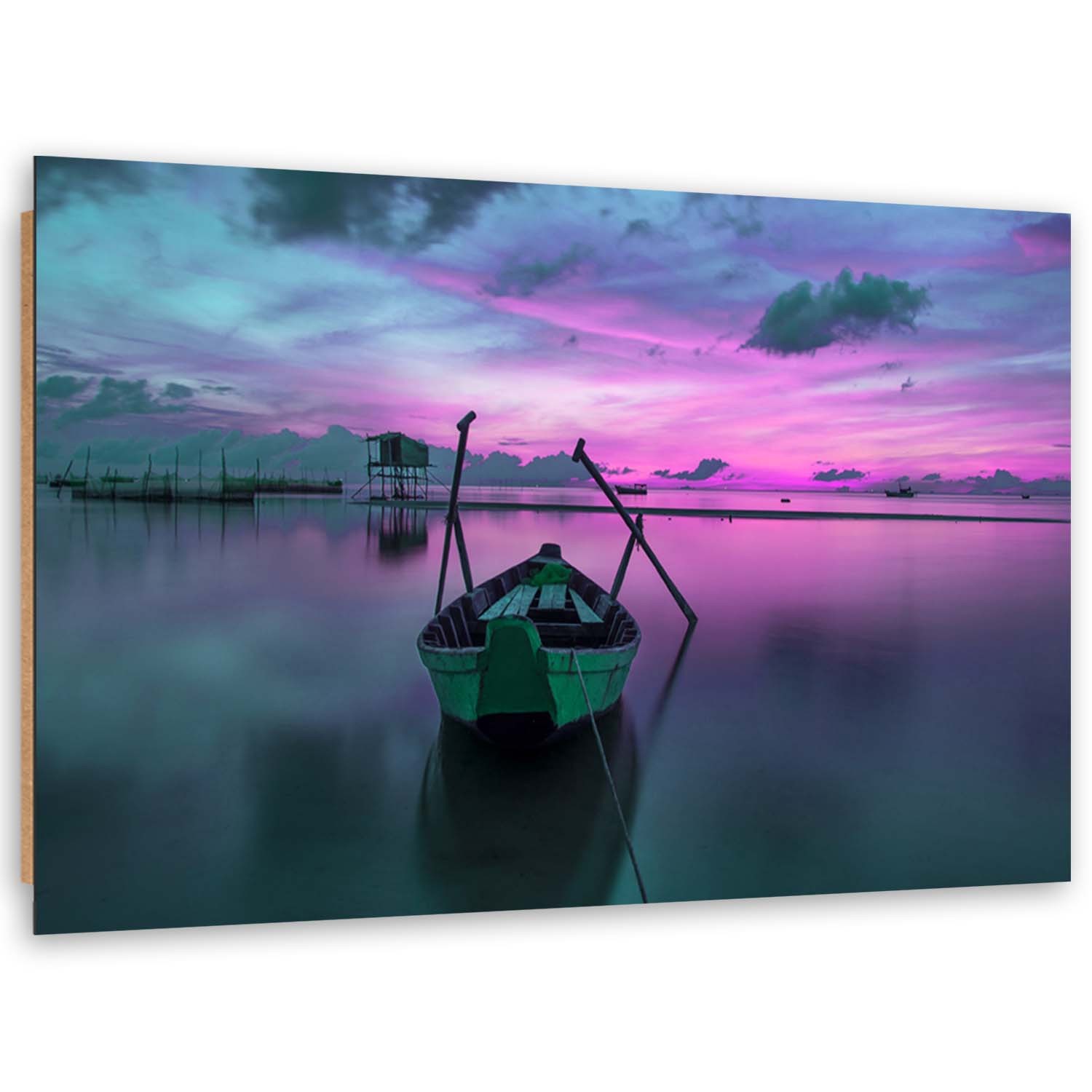 Informations sur le produit "Cadre décoratif en mdf avec image imprimée sur toile d'un bateau sur le lac couleur violette"