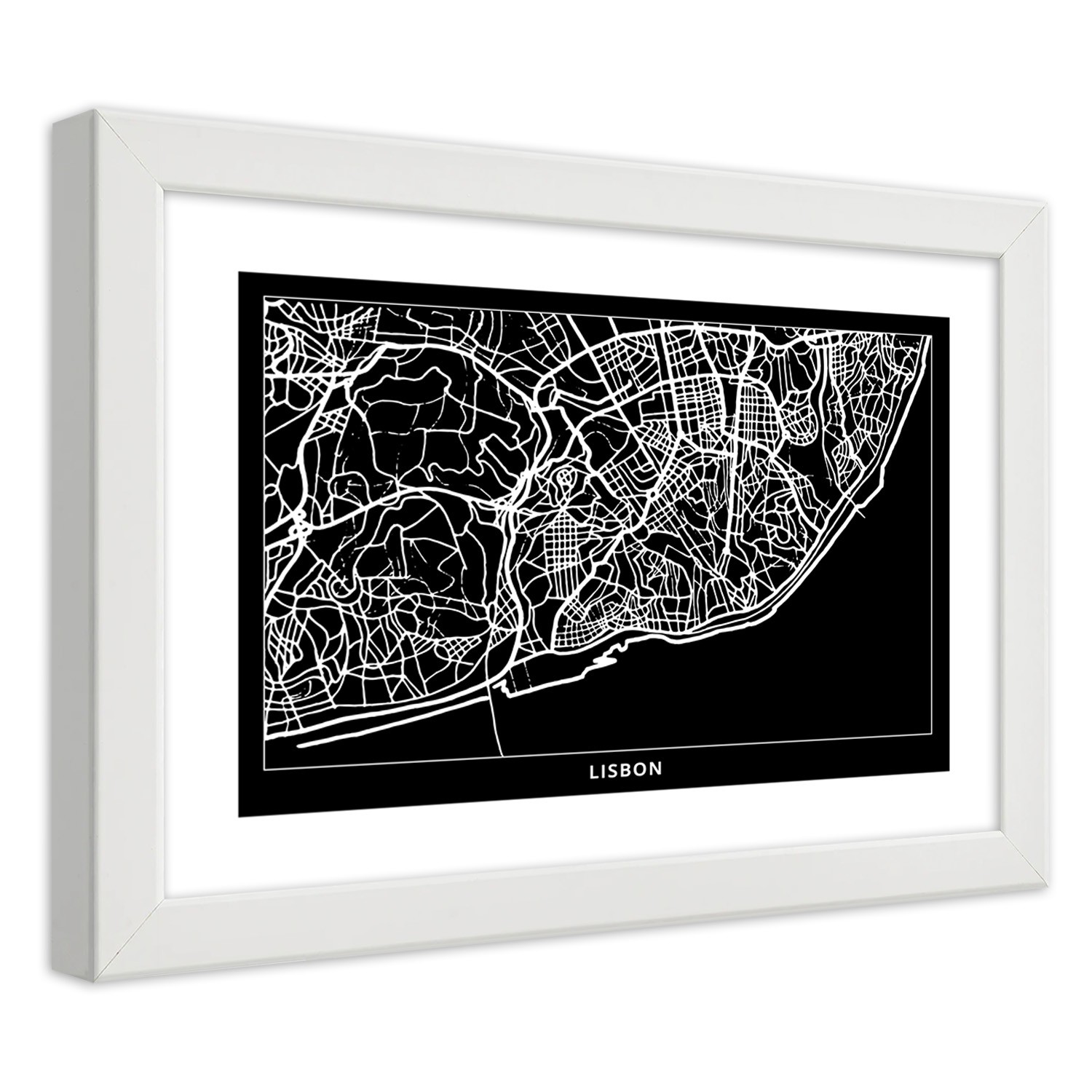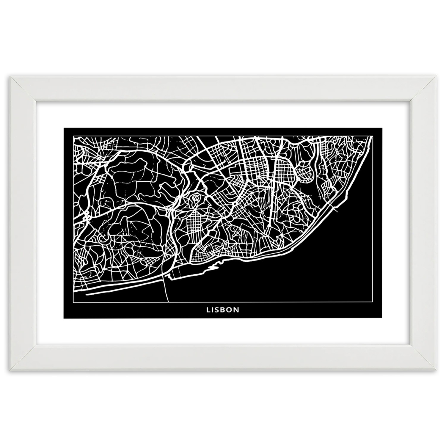 - Cadre en MDF (fibre de densité moyenne) d'un plan de la ville de Lisbonne imprimé sur papier satiné.