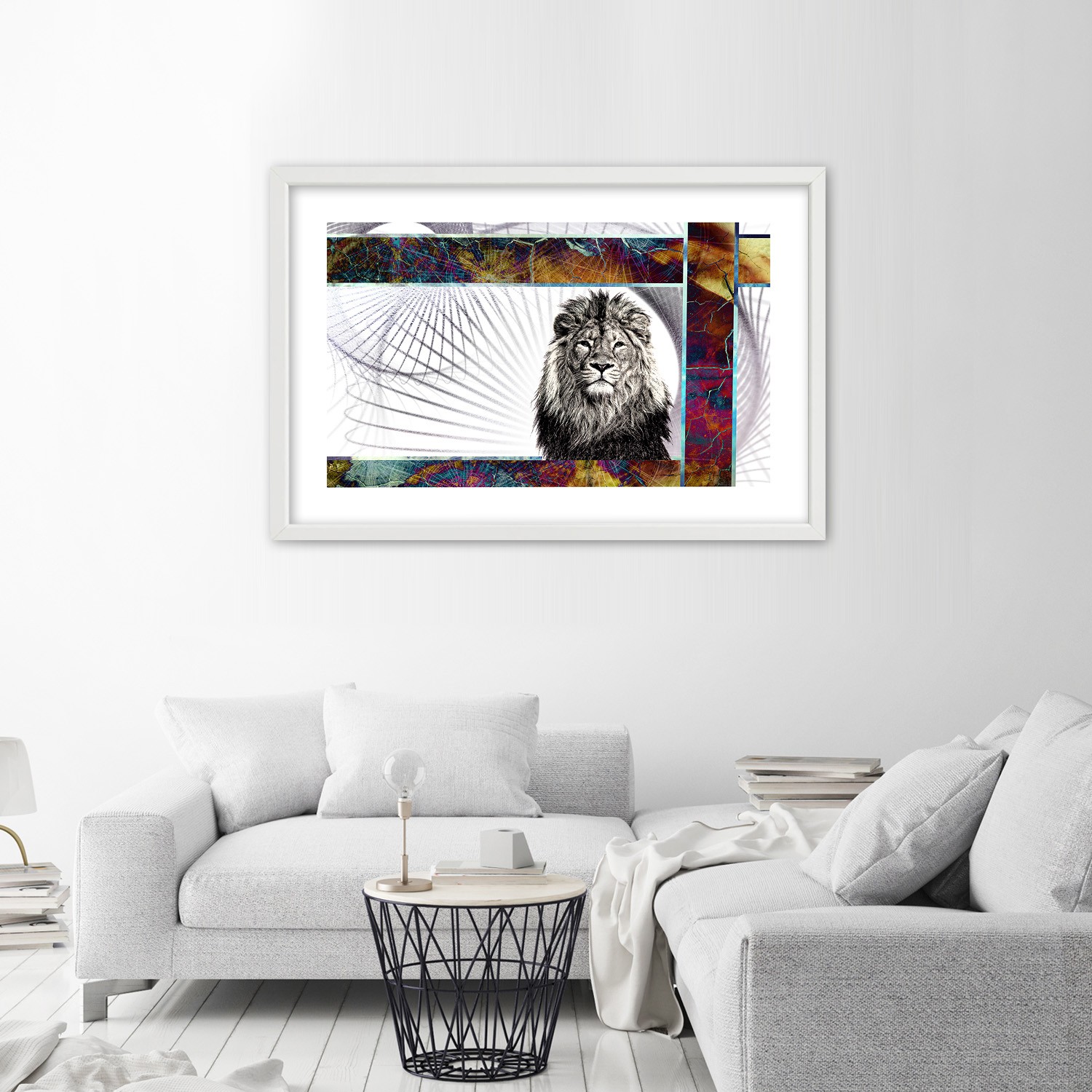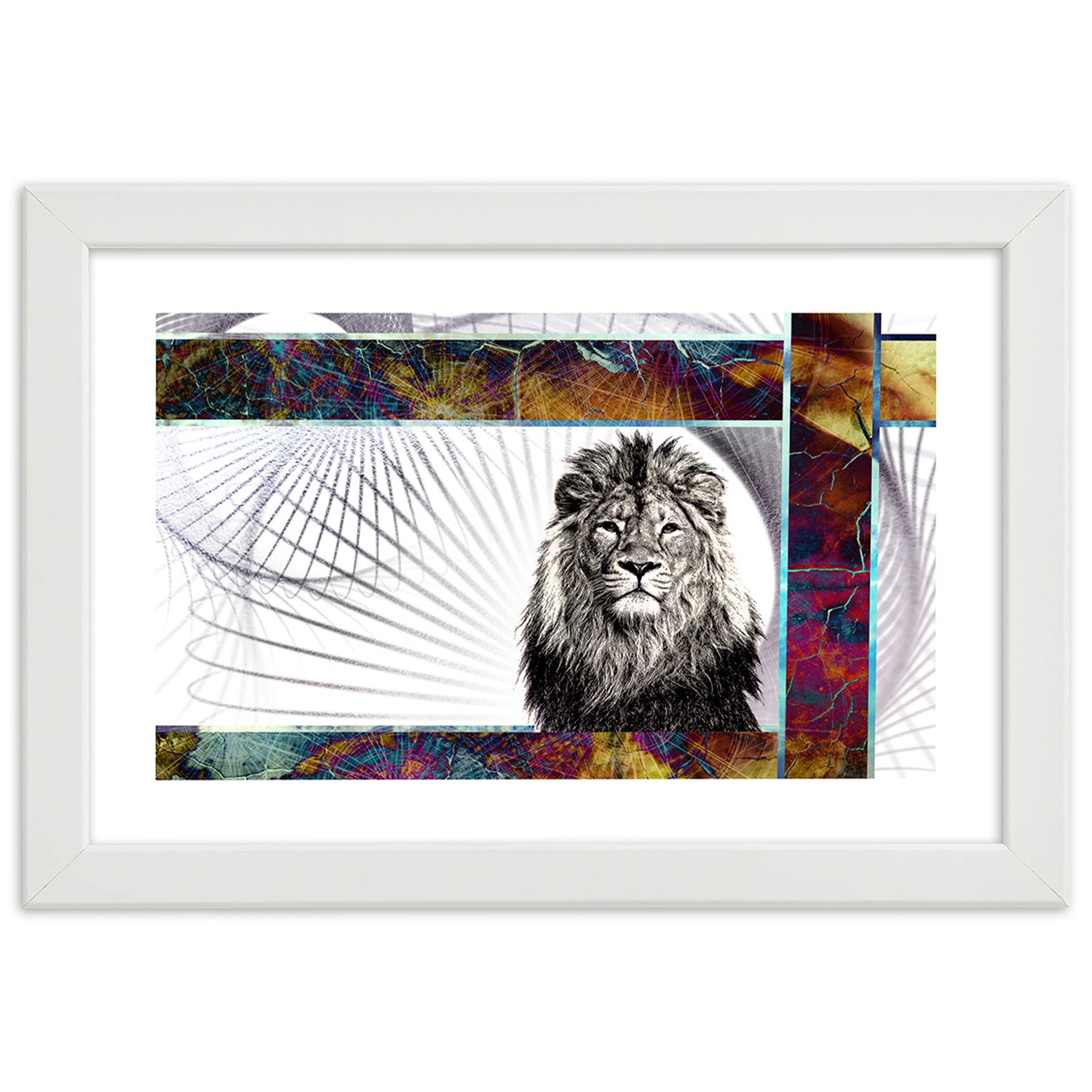Cadre imprimé sur papier satiné finition multicolore avec cadre en bois lion majestueux