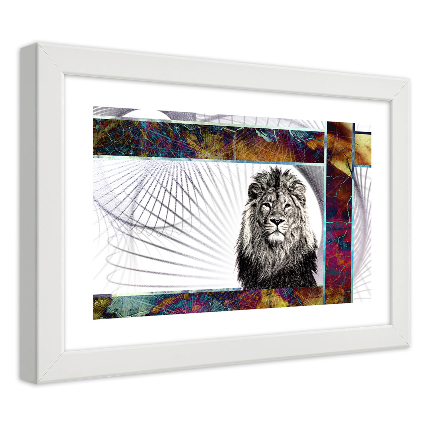 Informations sur le produit "Cadre imprimé sur papier satiné finition multicolore avec cadre en bois lion majestueux"