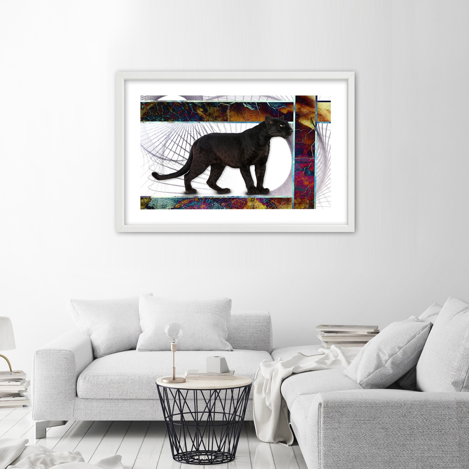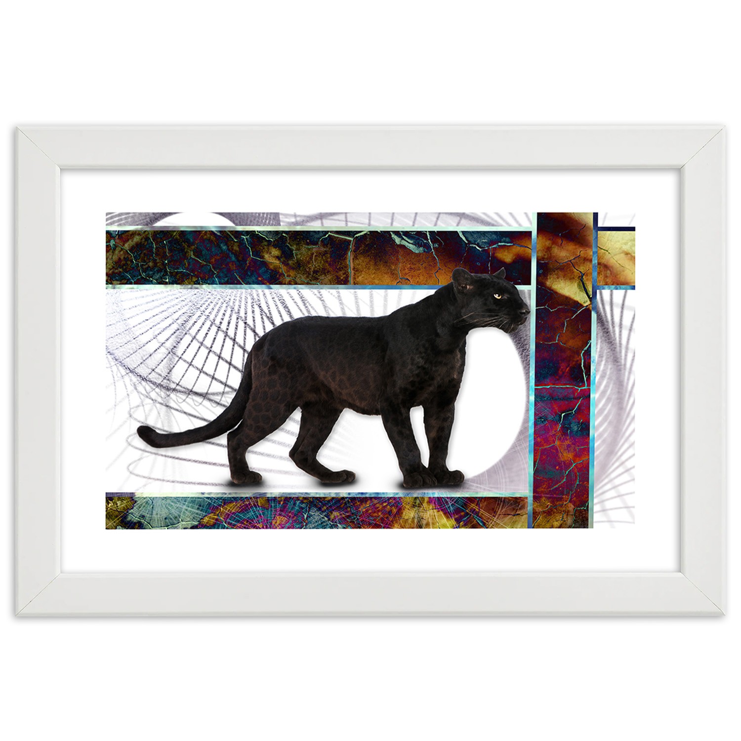 Cadre imprimé sur papier satiné finition multicolore avec cadre en bois panthère attentive
