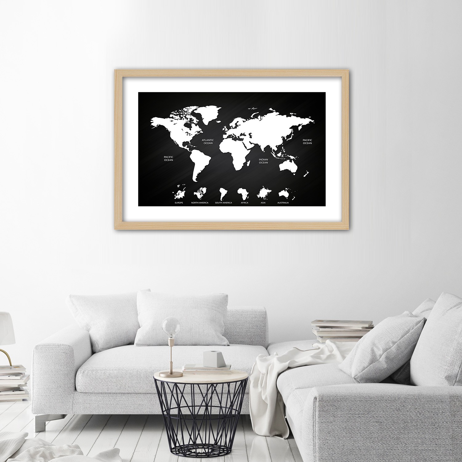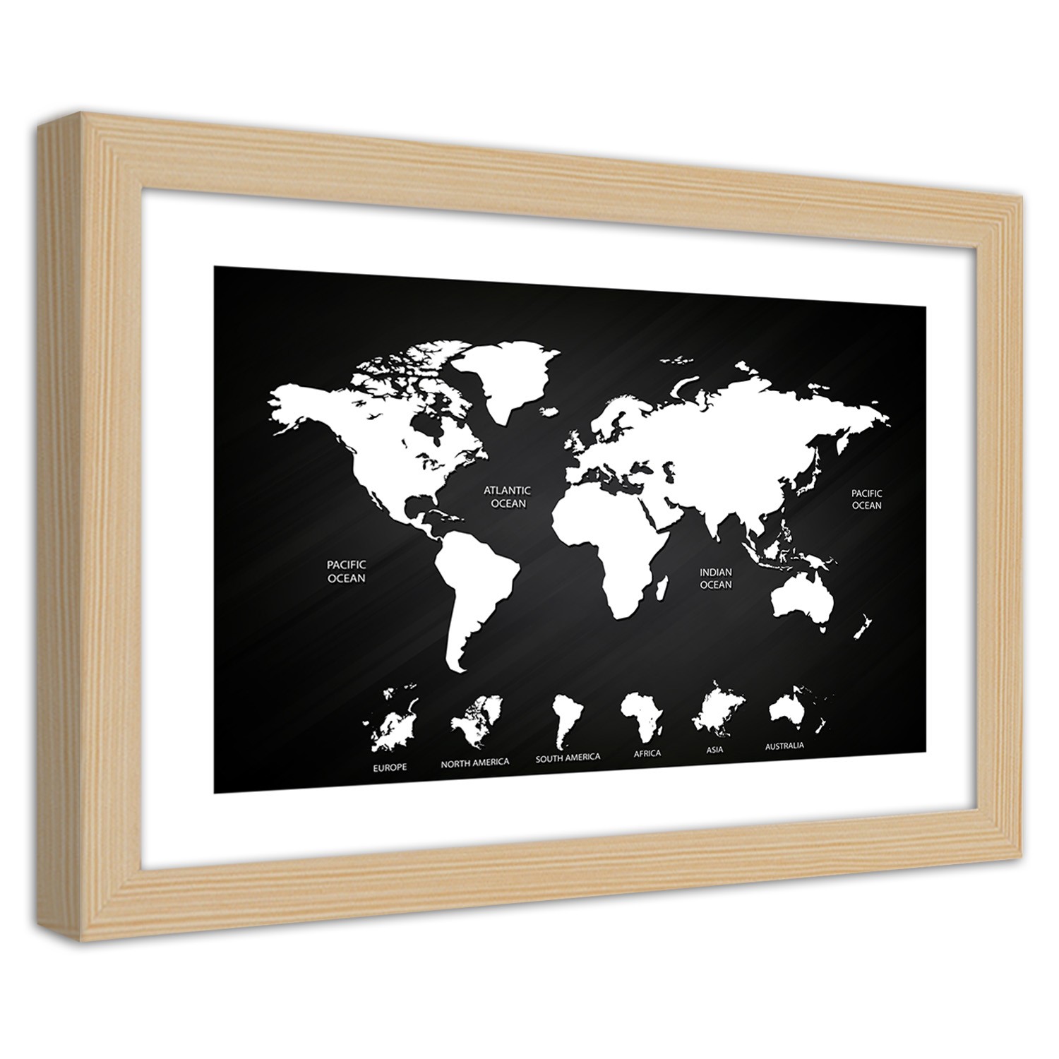 Description et caractéristiques - Cadre imprimé sur toile avec image d'une carte du monde et des continents fabriqué en MDF