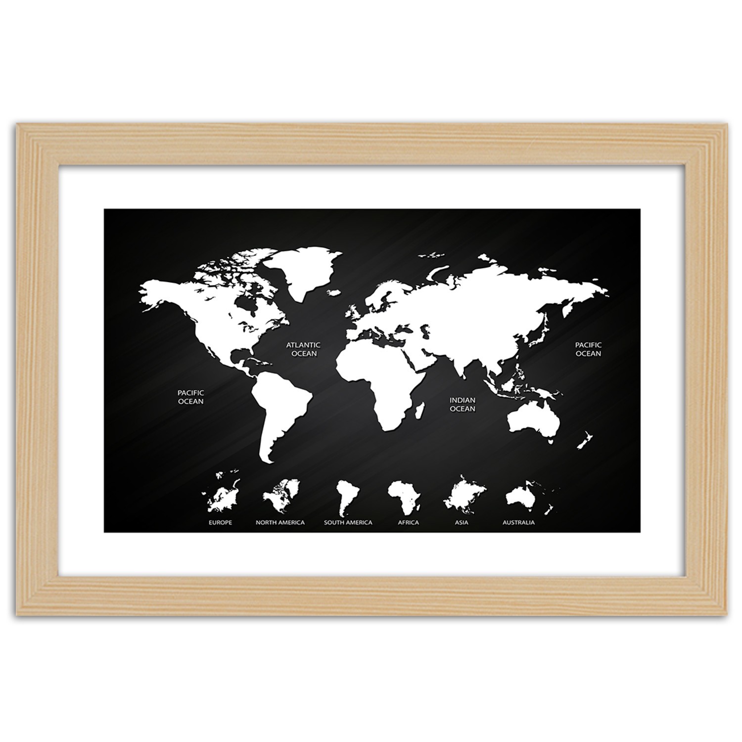 Informations sur le produit "Cadre imprimé sur toile avec image d'une carte du monde et des continents fabriqué en mdf"