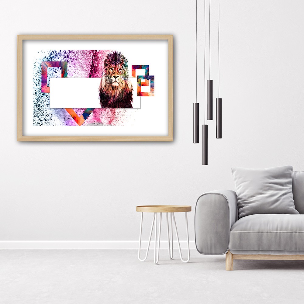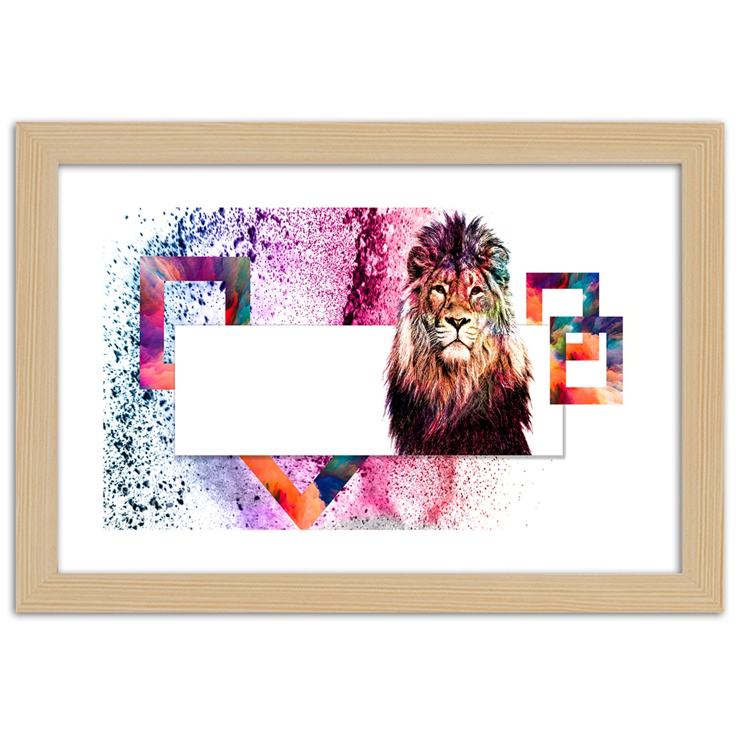 Description et caractéristiques - Cadre imprimé sur toile avec image de lion avec crinière de couleurs fabriqué en MDF