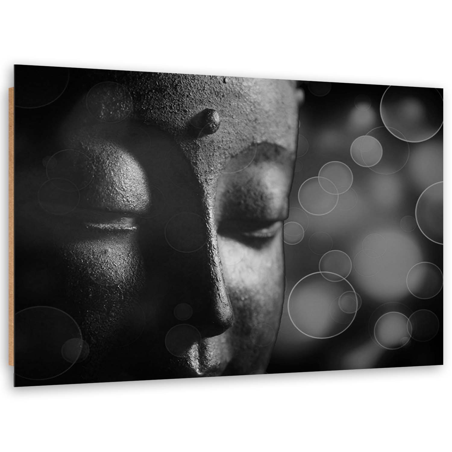 Description et caractéristiques - Cadre imprimé sur toile avec image de visage de bouddha de couleur blanc et noir fabriqué en MDF et toile