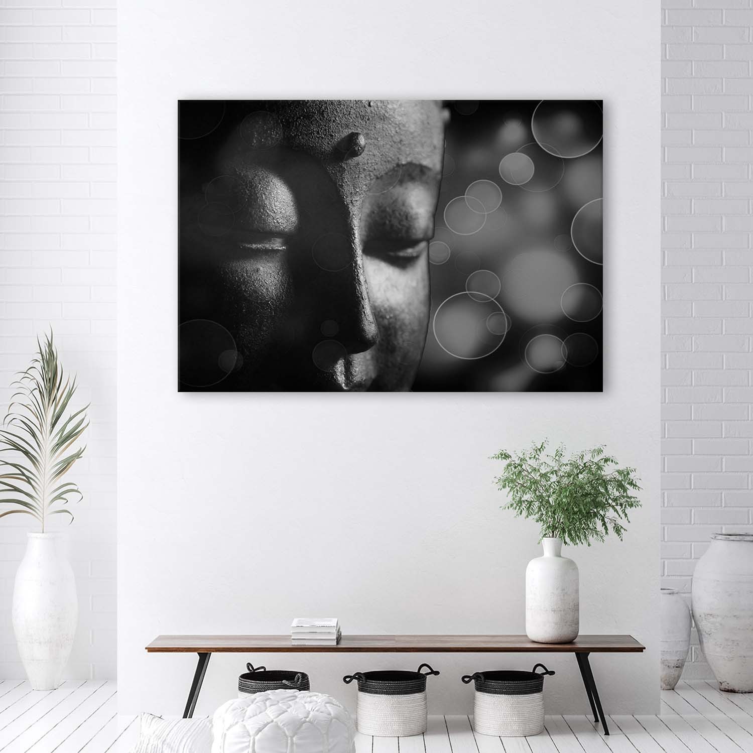 Cadre imprimé sur toile avec image de visage de bouddha de couleur blanc et noir fabriqué en mdf et toile