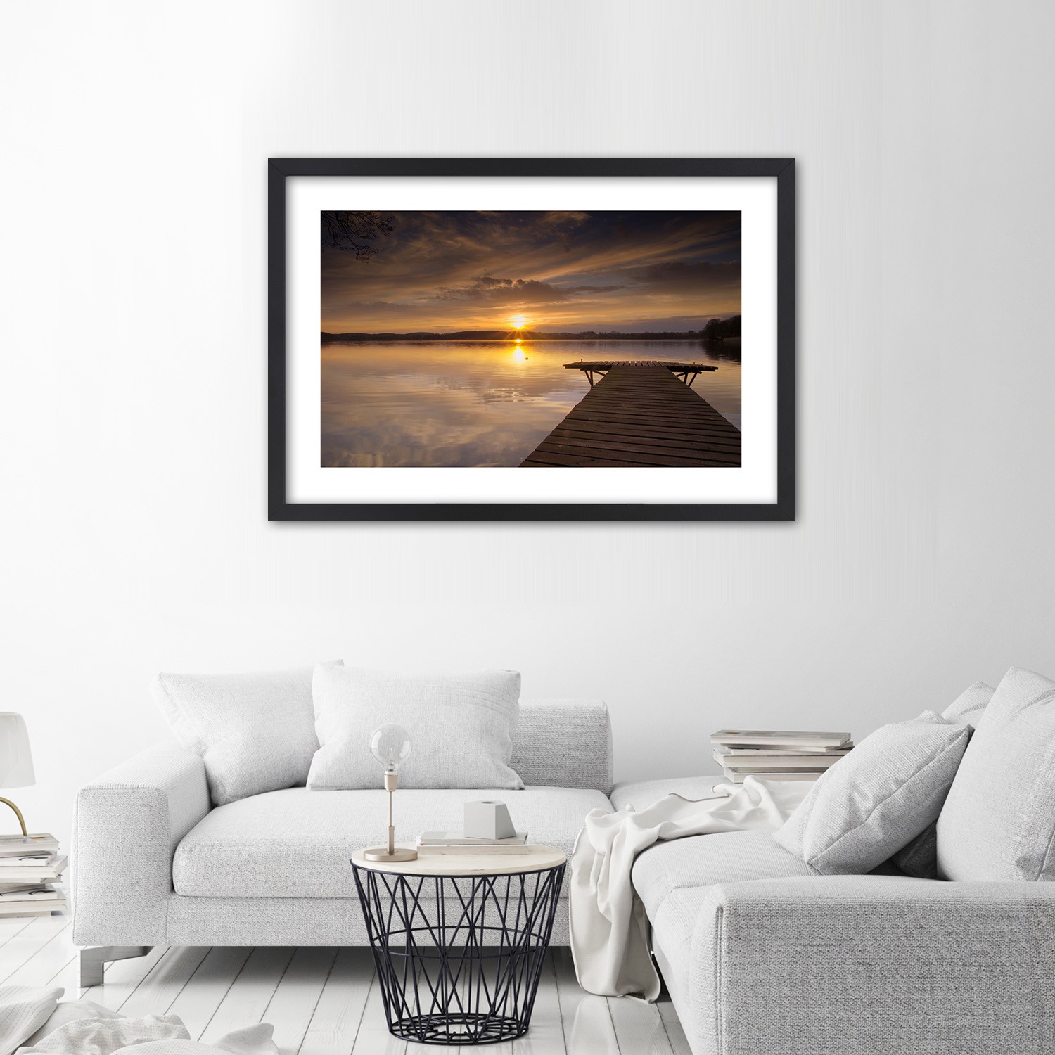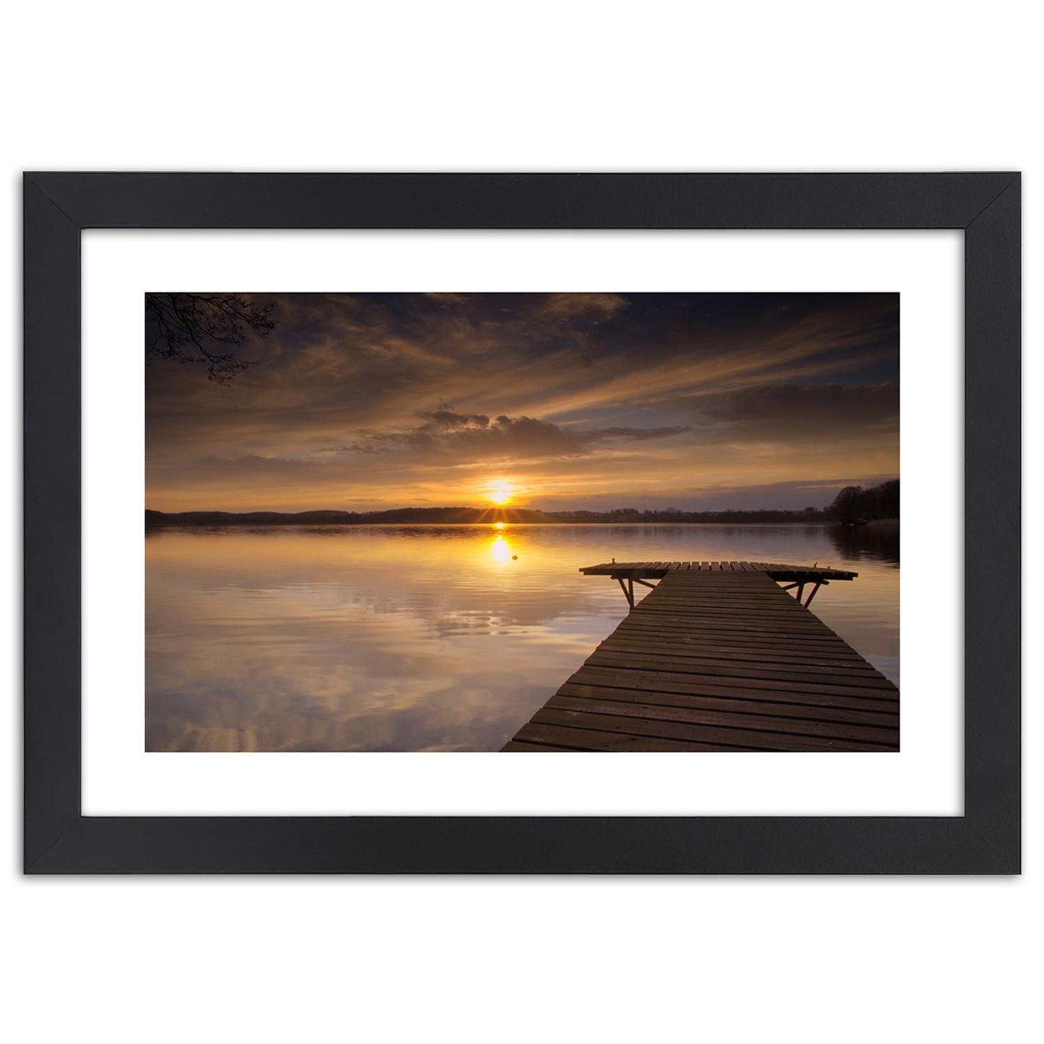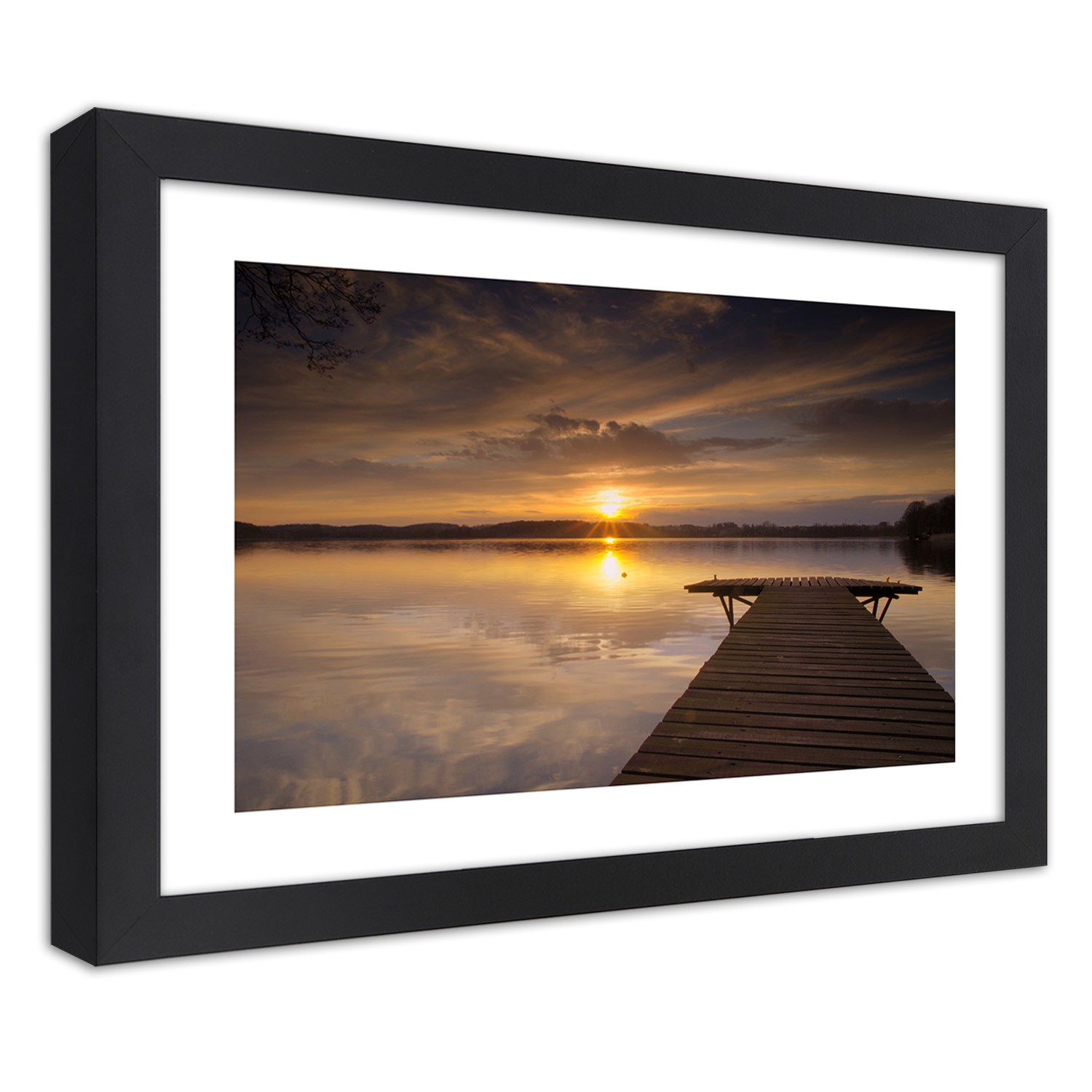 Informations sur le produit "Cadre noir en mdf plaqué avec poster décoratif ponton sur le lac"