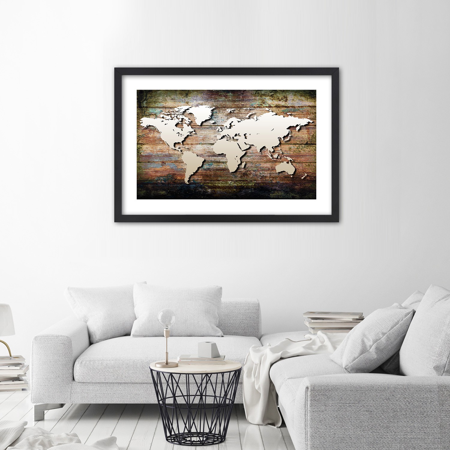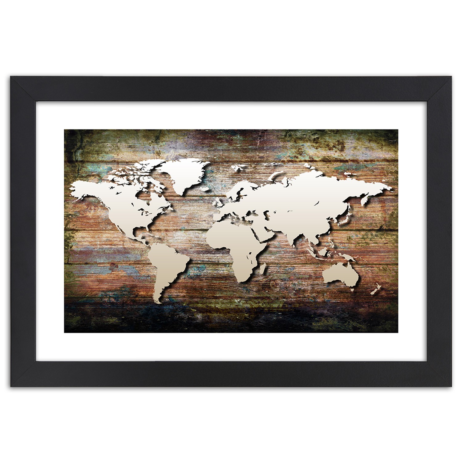 Cadre noir en mdf plaqué avec poster mappemonde sur panneaux de bois anciens