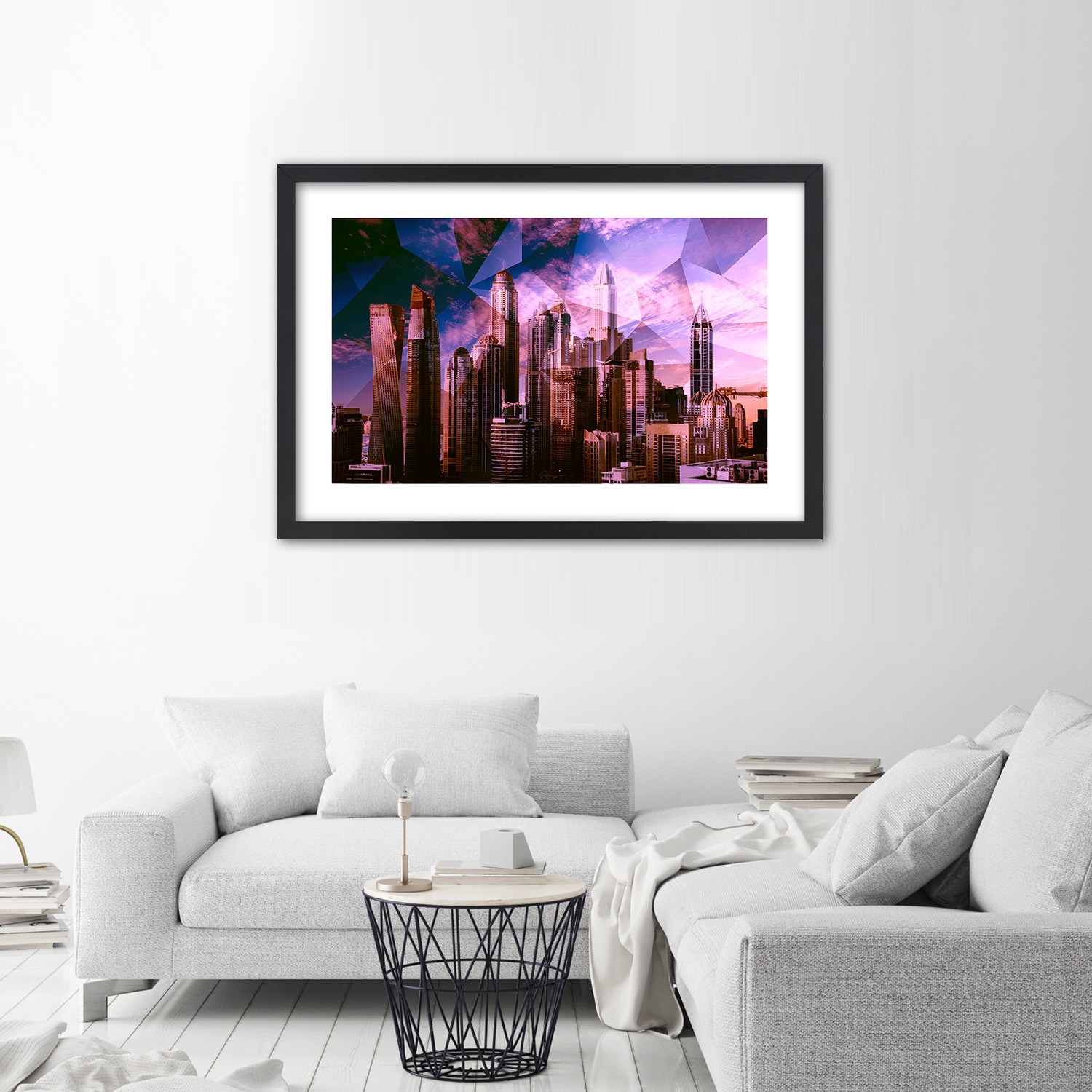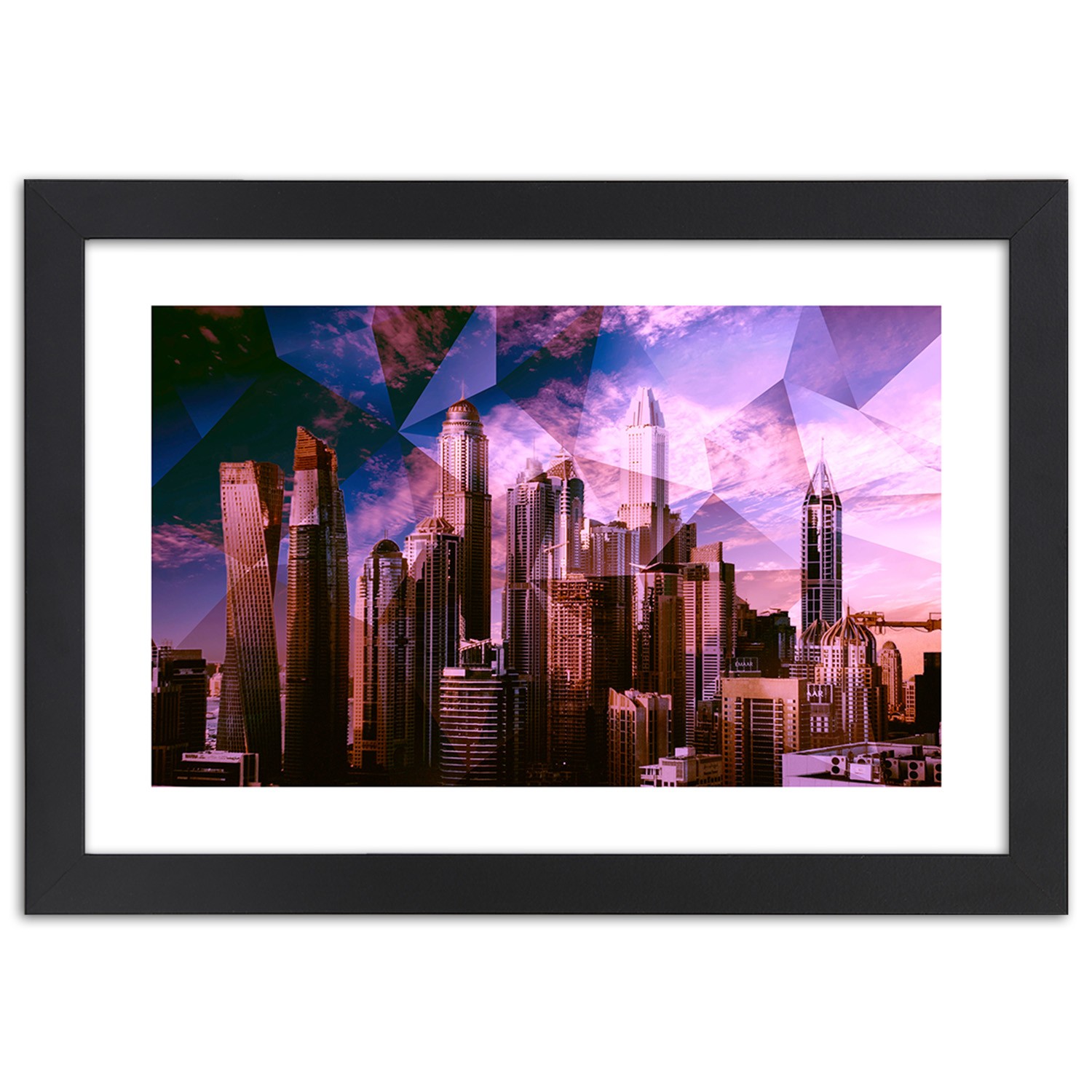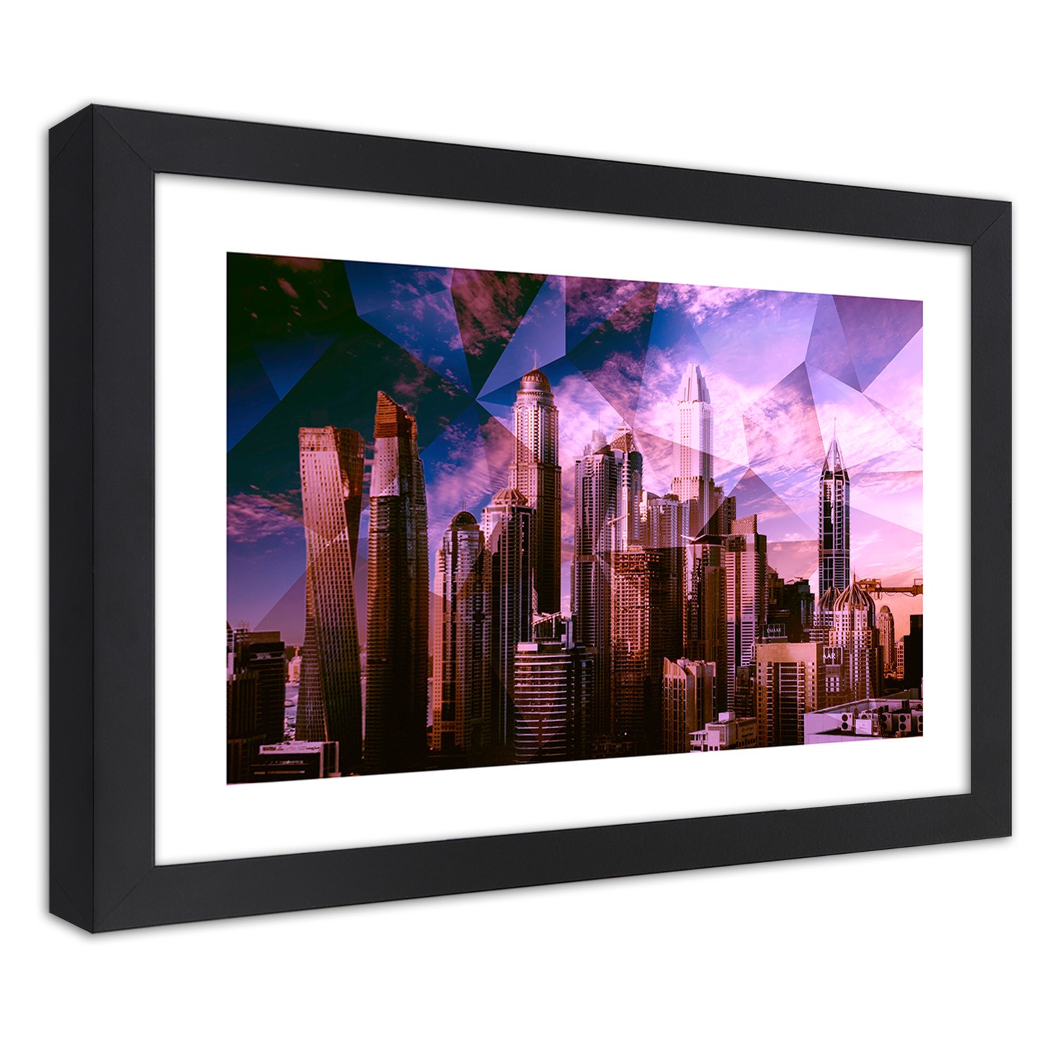 Informations sur le produit "Cadre noir en mdf plaqué avec un poster d'une ville géométrique violette"