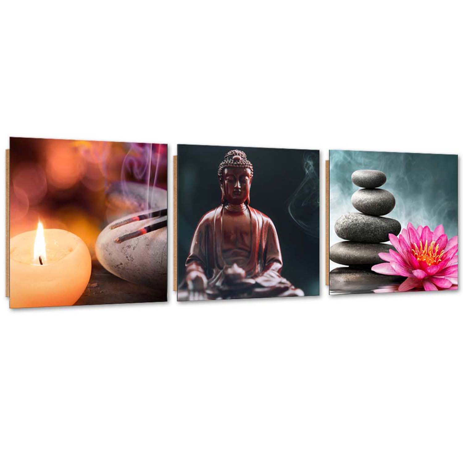 - Ensemble de trois cadres avec image « encens et bouddha » en toile et MDF (fibre de densité moyenne).