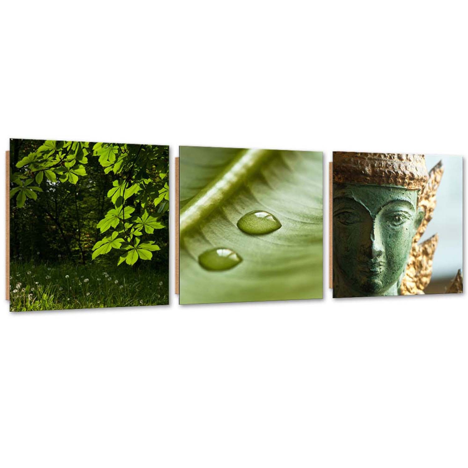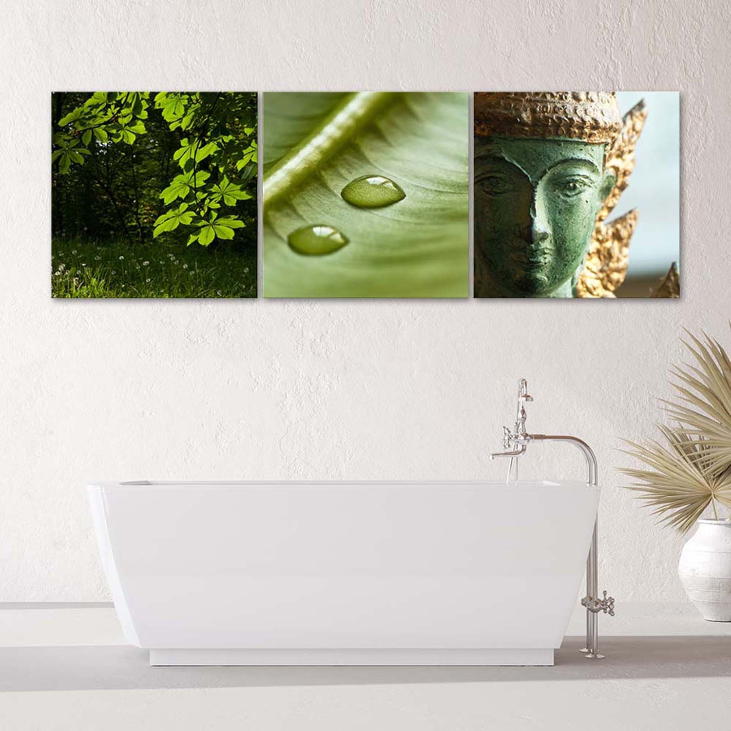 - Ensemble de trois cadres avec image « feuilles vertes et bouddha » en toile et MDF (fibre de densité moyenne).