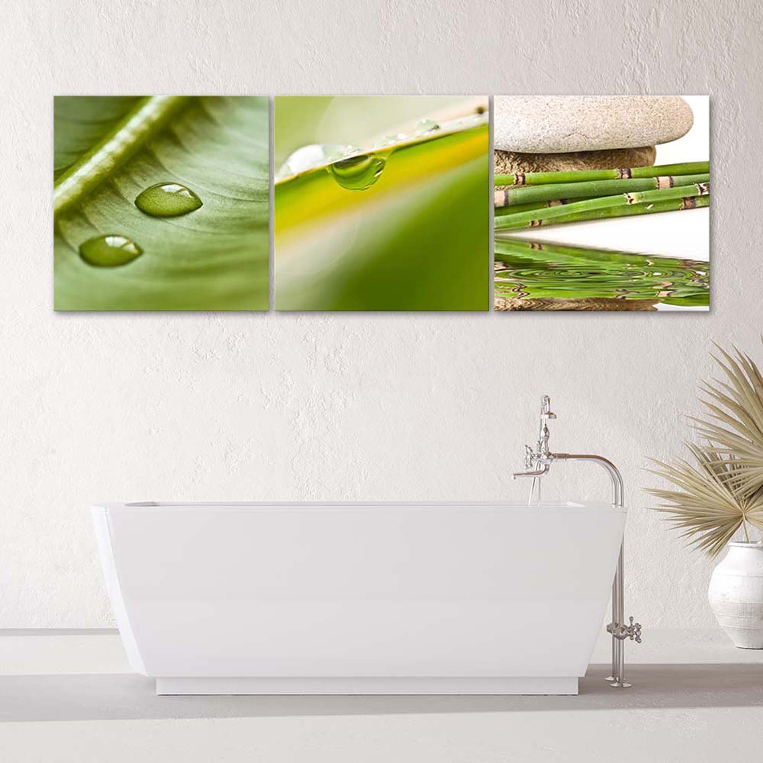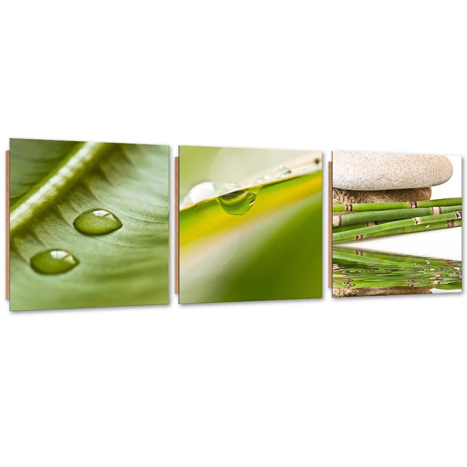 - Ensemble de trois cadres avec image « feuilles zen avec gouttes de rosée » en toile et MDF (fibre de densité moyenne).