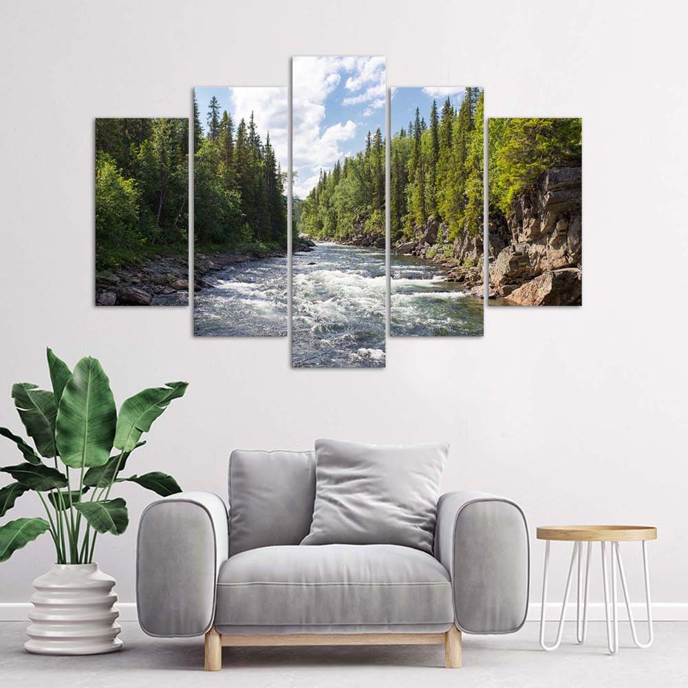 Five piece picture canvas print, River in a forest