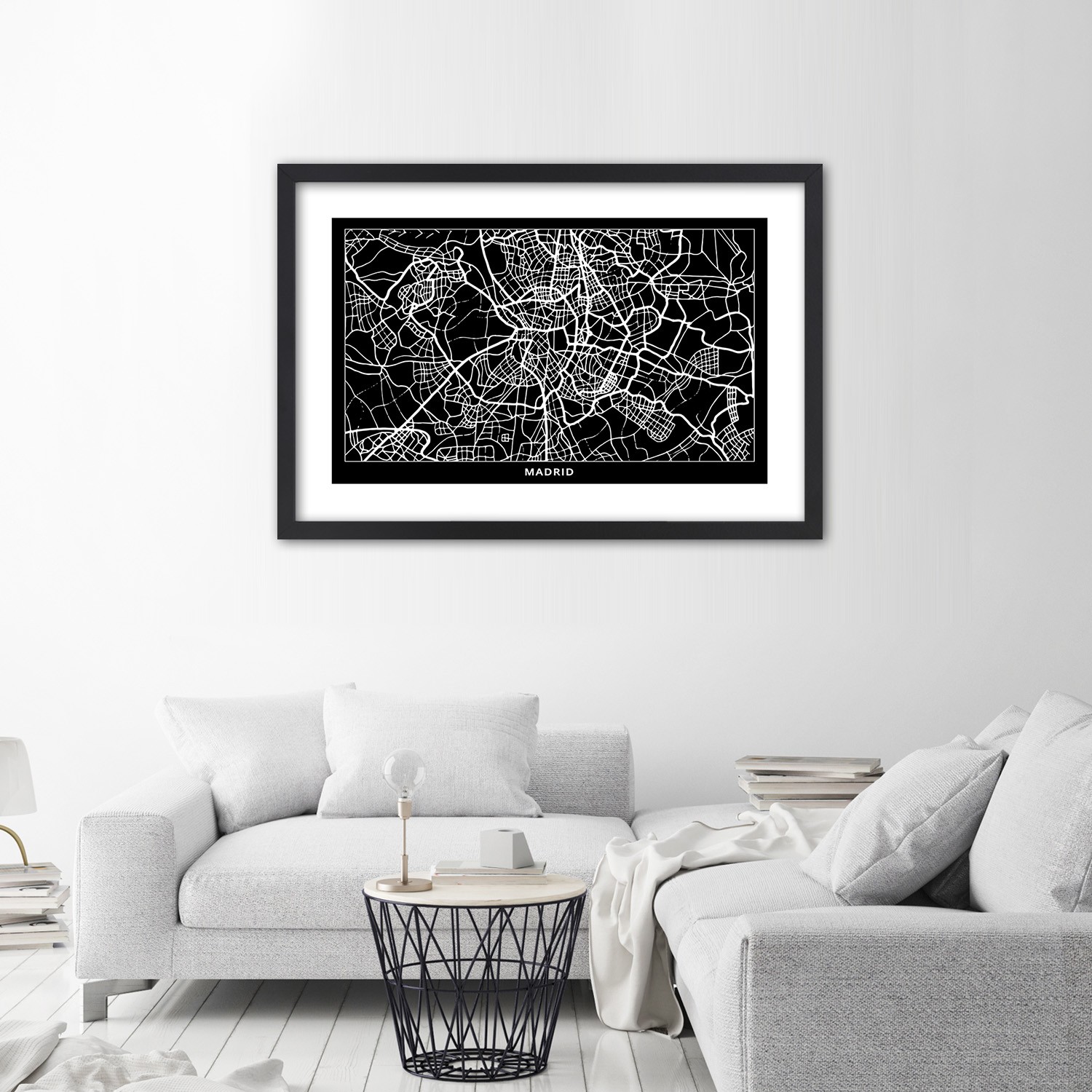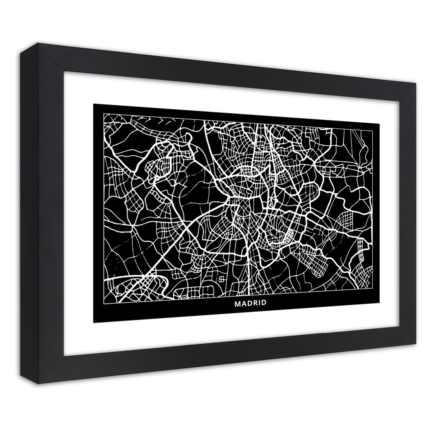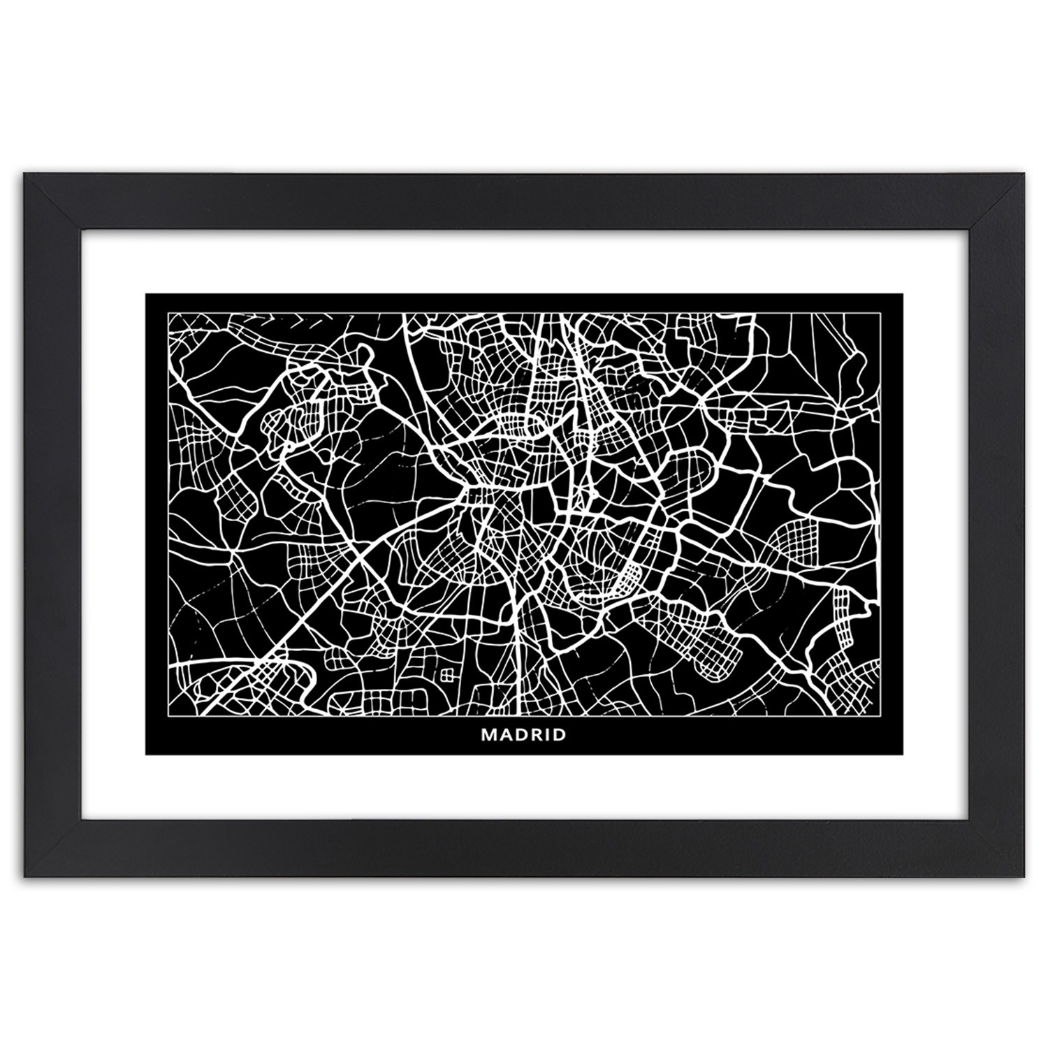 Description et caractéristiques - Impression sur toile avec cadre noir et blanc image d'un plan de Madrid fabriqué en MDF
