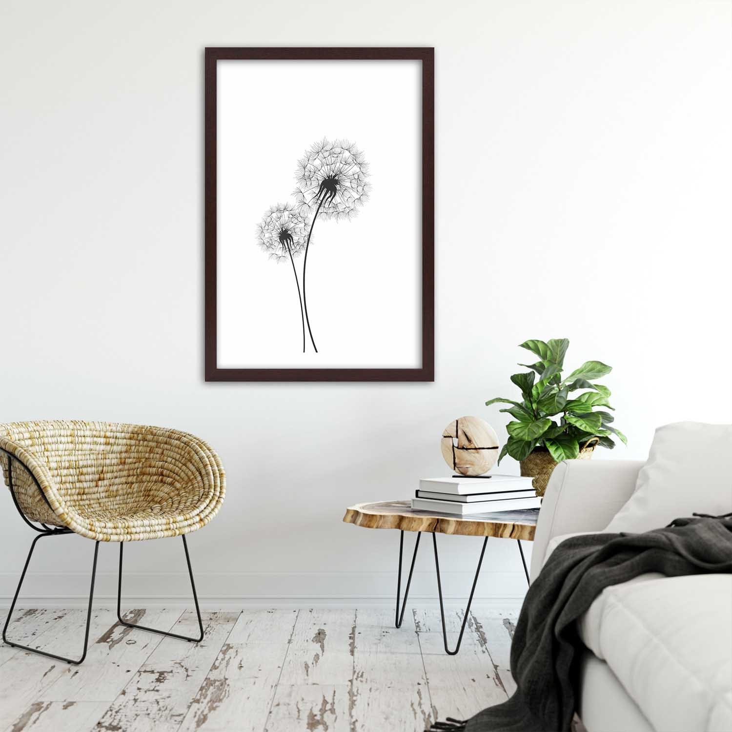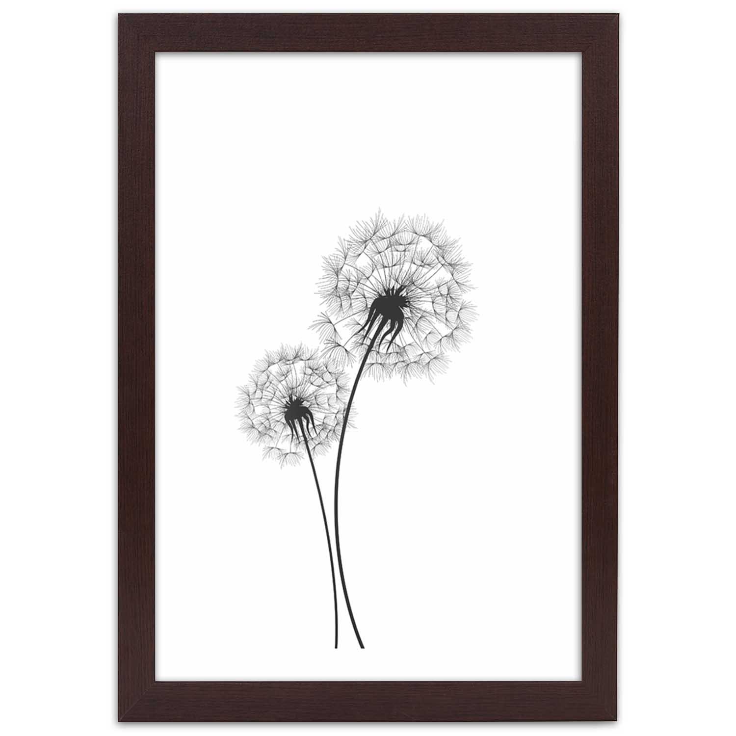 Picture in brown frame, Drawn two dandelions