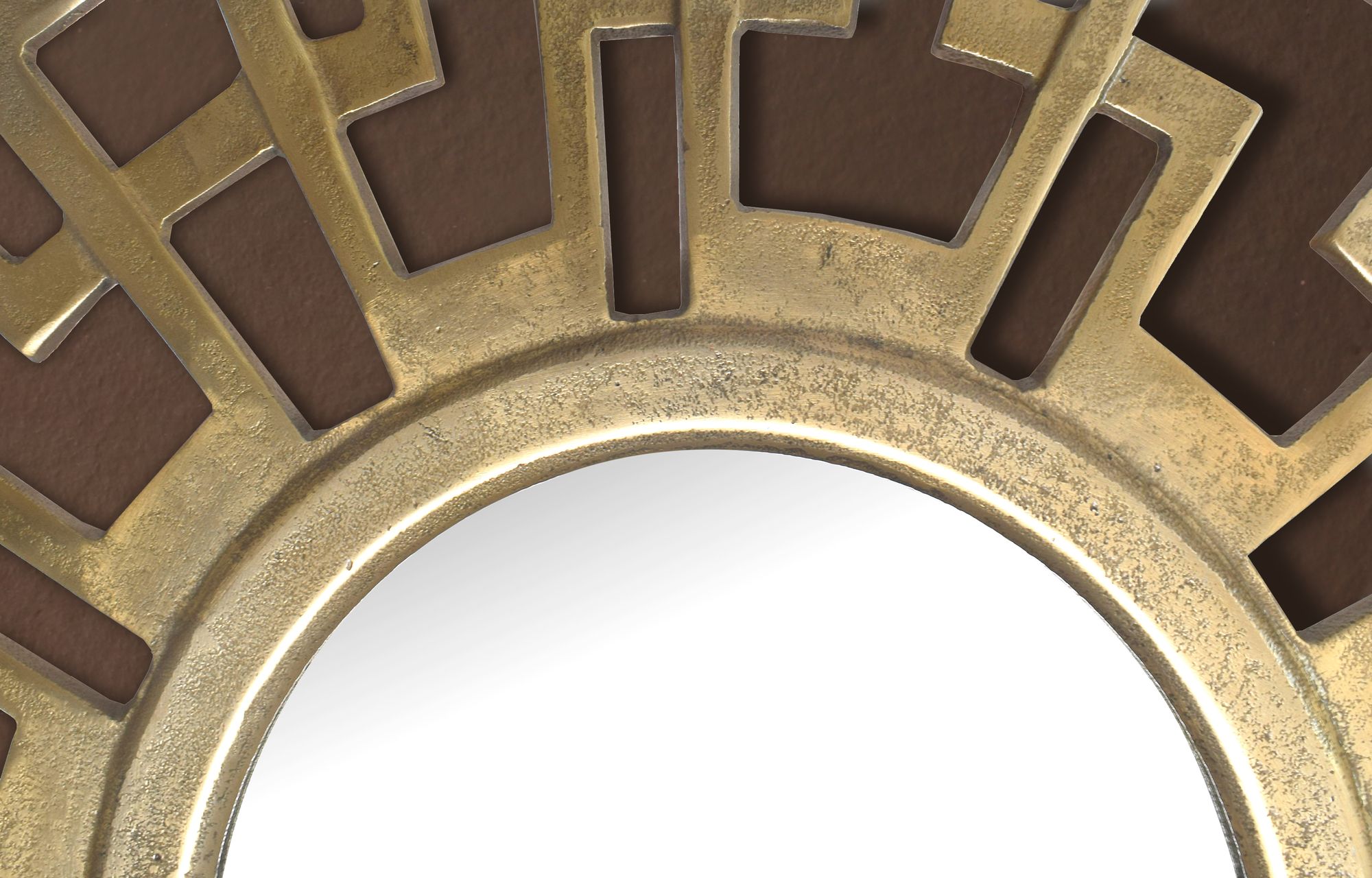 Add an elegant Art Deco touch to your interior with this round 60 cm wall mirror. The gold aluminum frame features a geometric pattern perfectly surrounding a 24 cm diameter mirror surface, delivering a contemporary and refined design ideal for living rooms, hallways or bedrooms.
