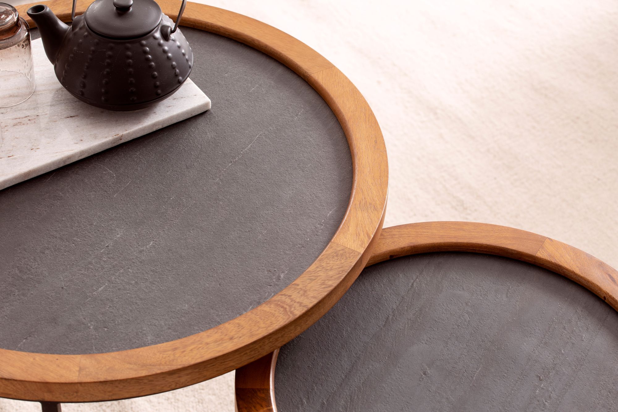 Enhance your living room with this stylish 2-piece round coffee table set featuring solid mango wood rims and stone-look tabletops. The warm natural wood grain borders combined with the elegant anthracite 3D surface plates and sturdy black metal frames offer durability and modern charm.