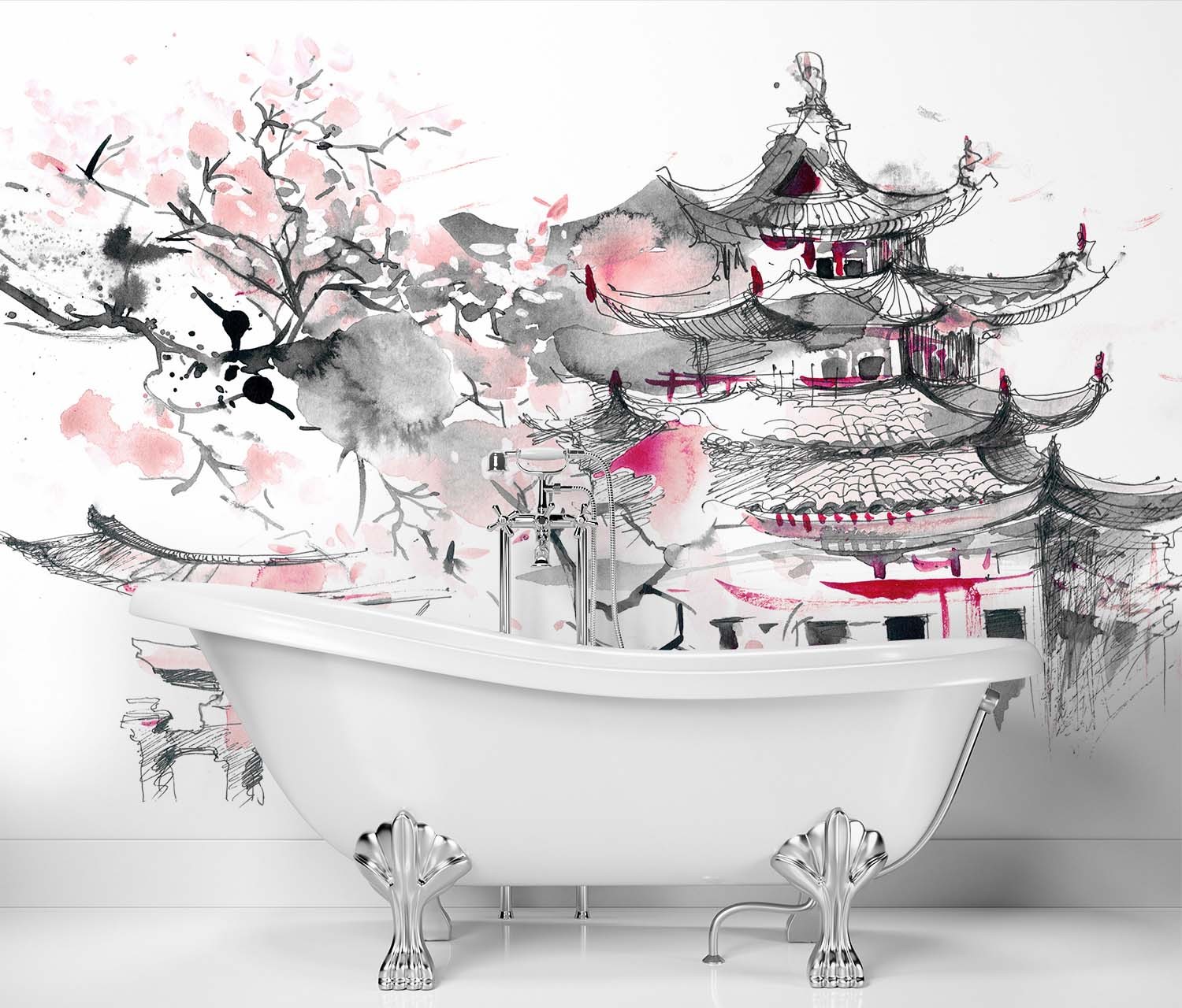 Informations sur le produit "Papier peint rectangulaire avec image d'une pagode japonaise imprimée sur toile avec finition grise"