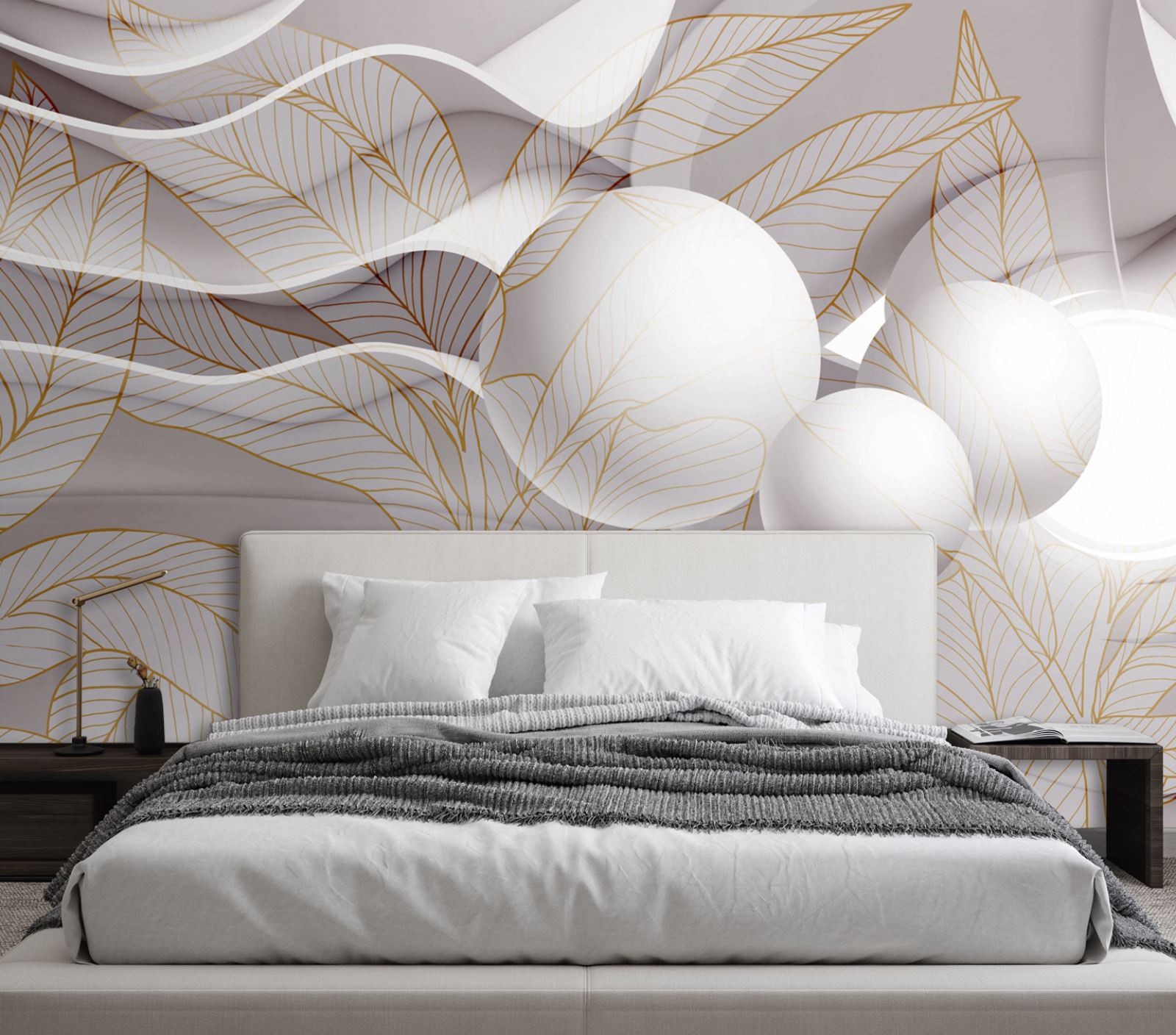 Description et caractéristiques - Papier peint rectangulaire résistant à l'eau imprimé sur toile feuilles d'or et boules 3D