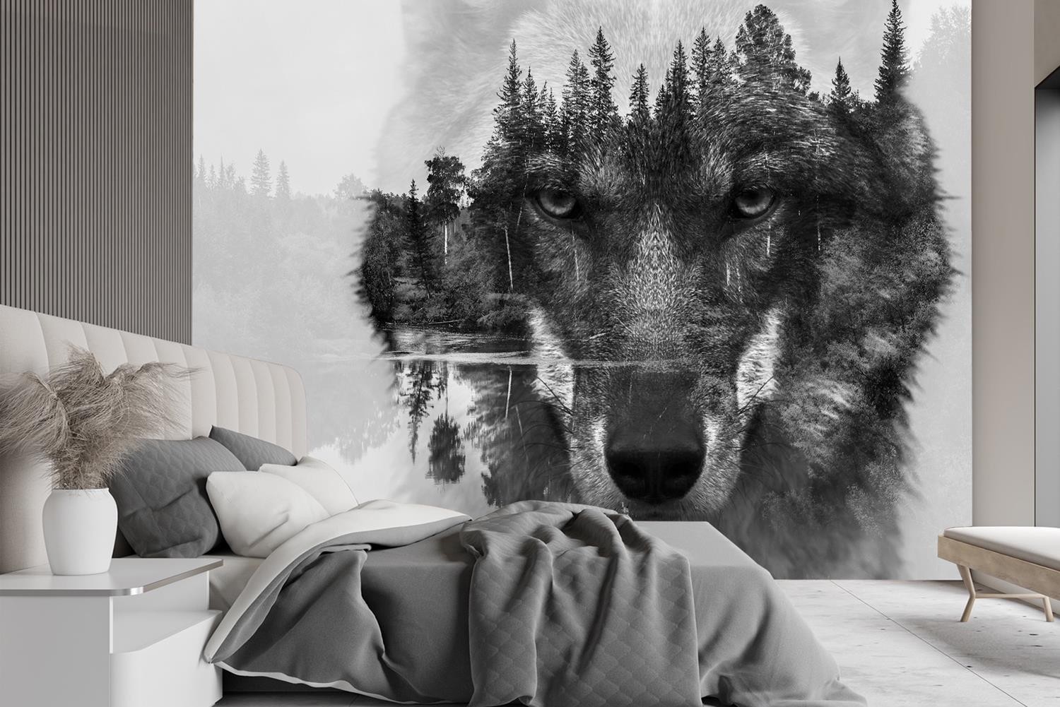 Informations sur le produit "Photo murale pour salon au style abstrait et moderne animaux du bois loup et brouillard"