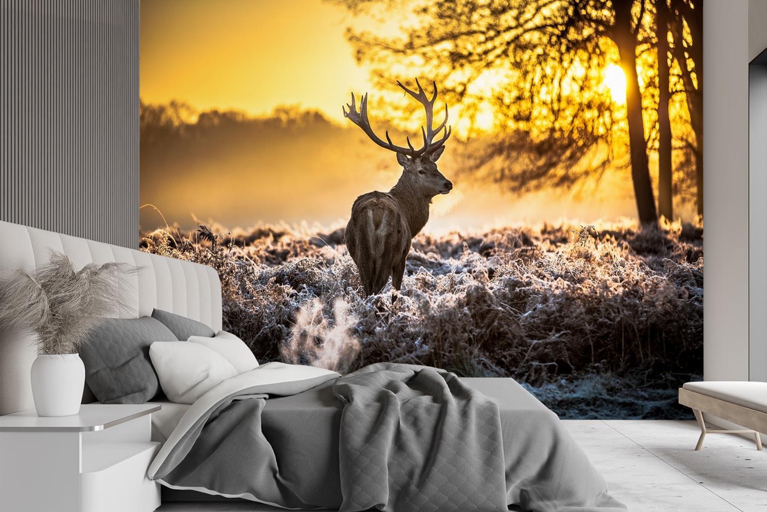 Photo murale pour salon avec image de cerf dans la prairie au lever du soleil