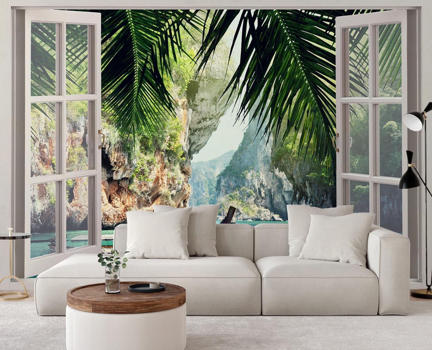 - Photo murale décorative moderne : vue sur une plage tropicale depuis la fenêtre.