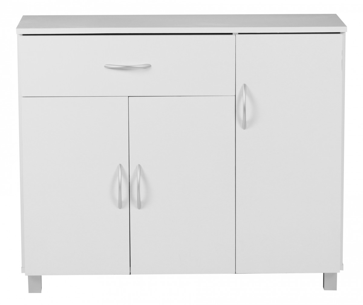Le buffet design SETE en finition blanche mate séduit par son style épuré et contemporain. Composé d'un tiroir fonctionnel et de trois portes avec poignées aluminium gris, il s'adapte parfaitement aux espaces restreints et offre une solution de rangement élégante pour chambre ou salle à manger.
