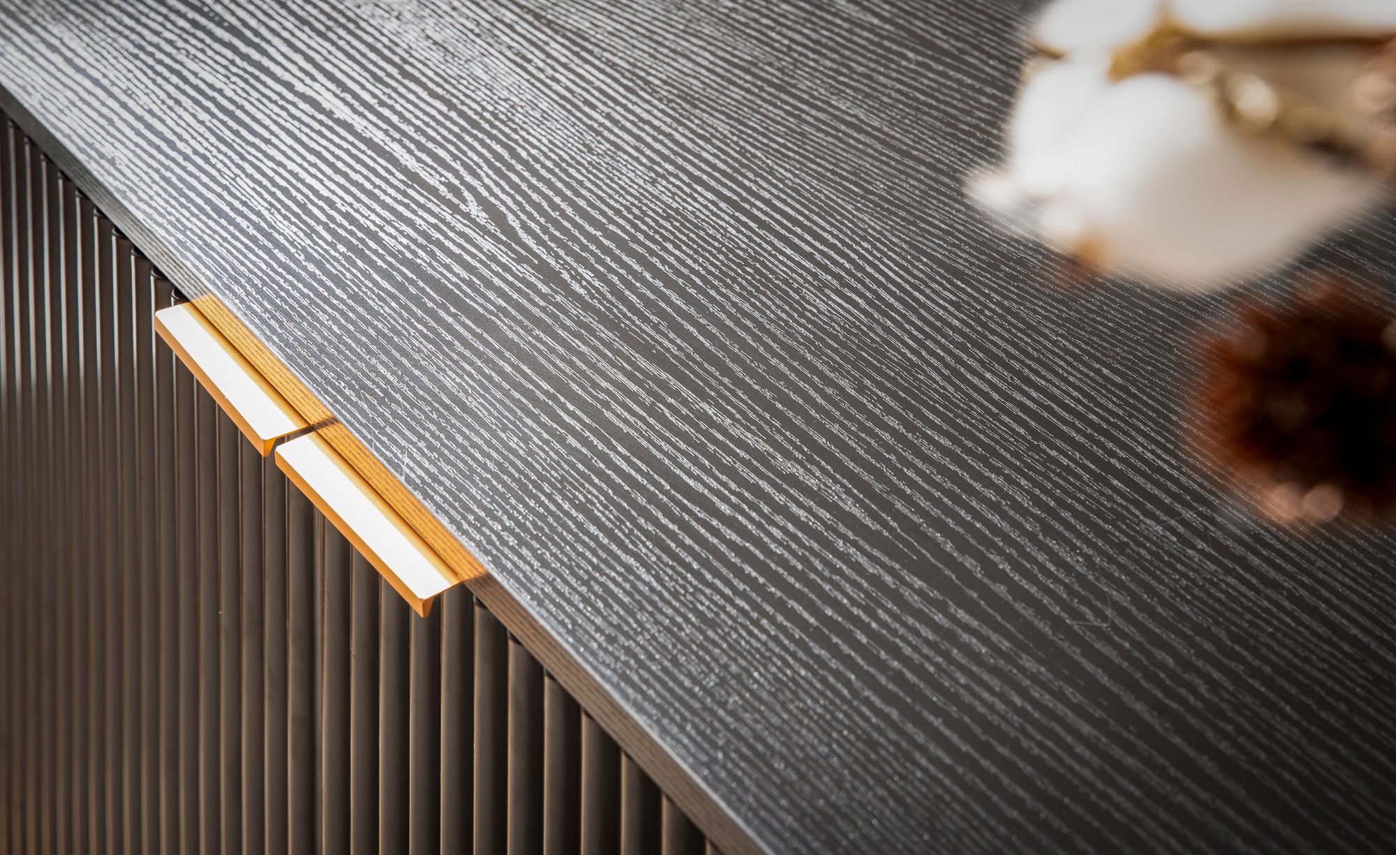 - Matériaux : panneau laminé imitation chêne noir, pieds et poignées en métal peint