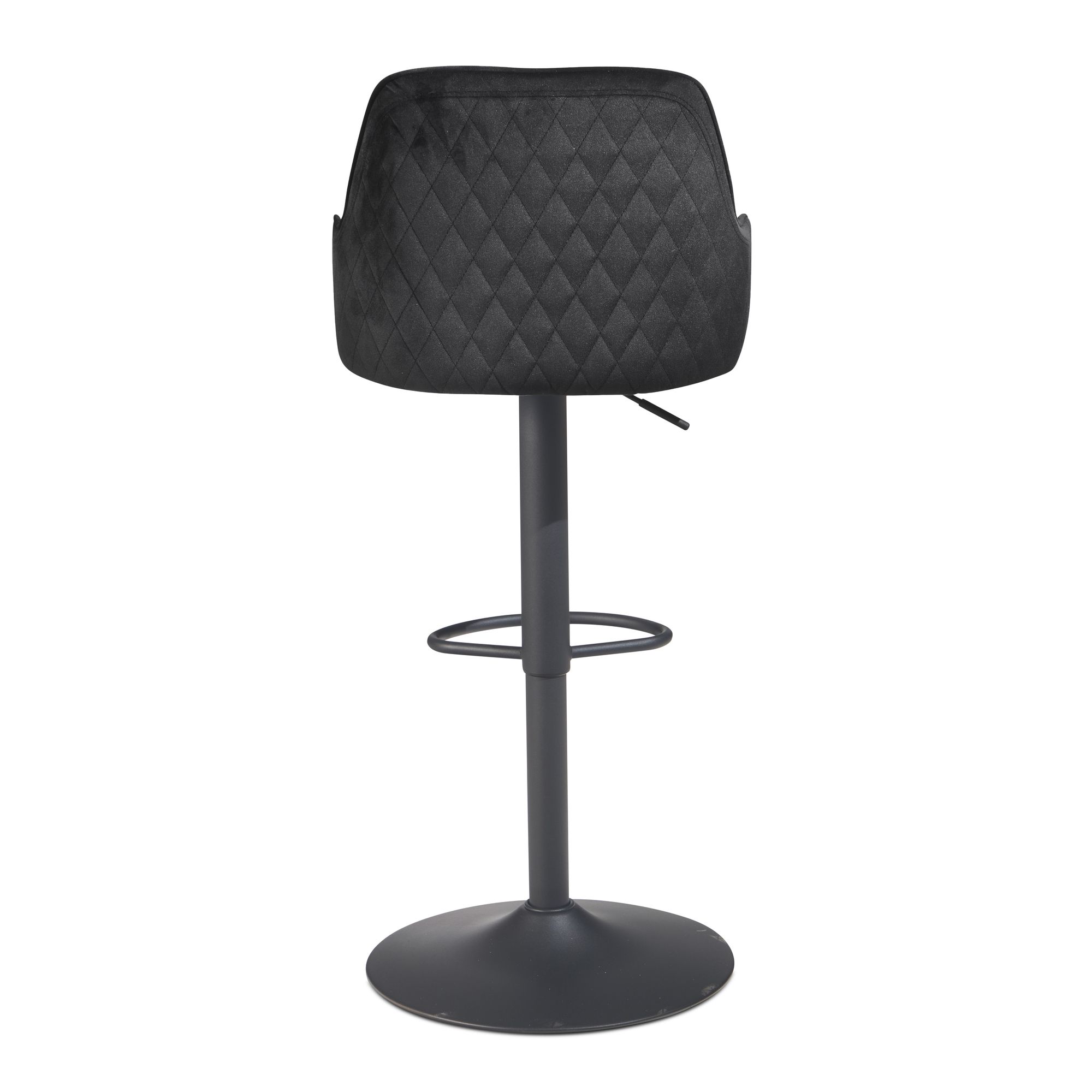 Découvrez ce tabouret de bar moderne en velours noir alliant confort et design élégant. Son assise agréablement moulée avec capitonnage losangé aux accoudoirs et dossier offre un confort optimal. Le piètement trompette en métal apporte stabilité et touche contemporaine, tandis que la hauteur réglable (86-106 cm) s'adapte parfaitement à votre plan de travail ou bar.