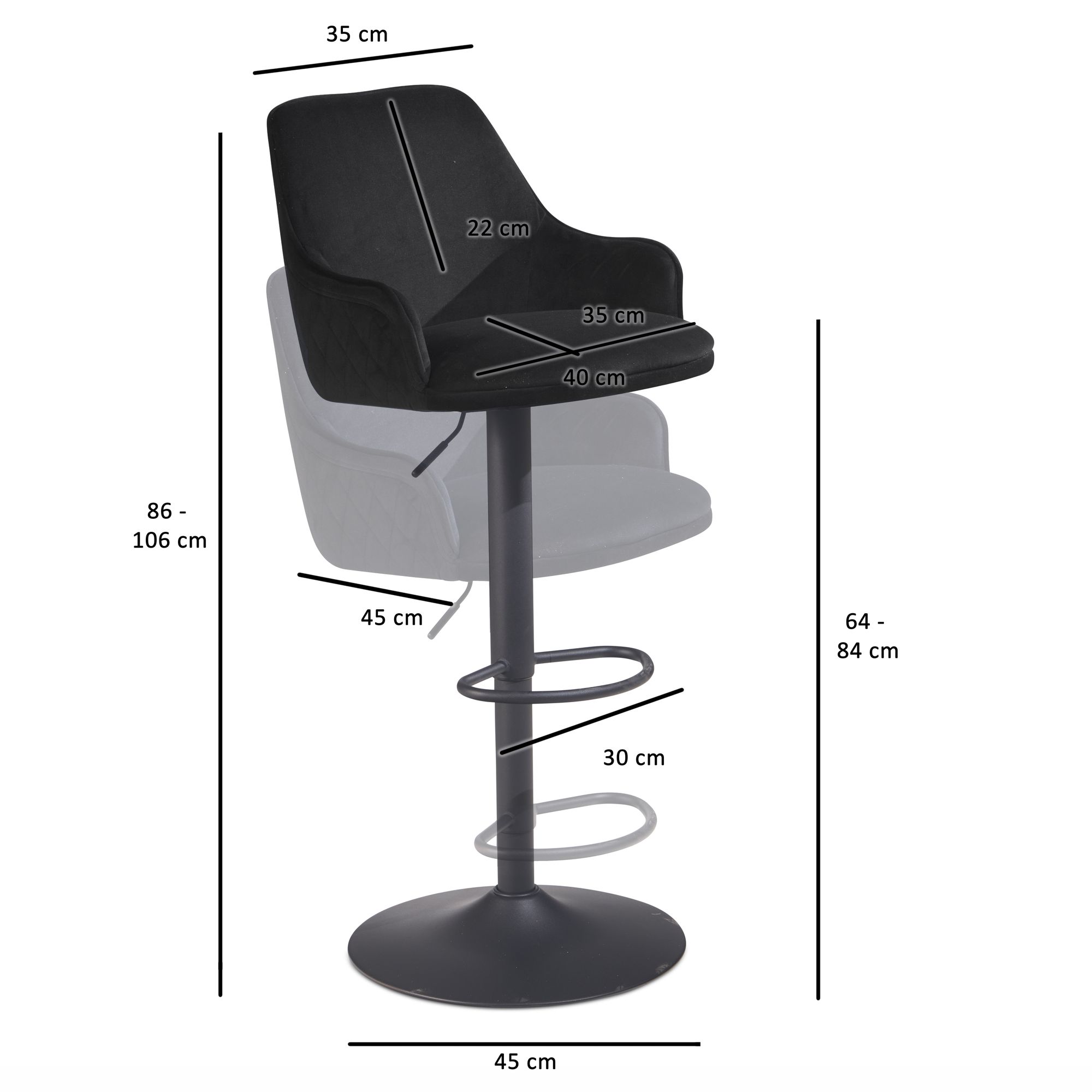 Informations sur le produit "Tabouret de bar en velours noir | Métal trompette | Hauteur réglable 86-106 cm"